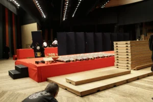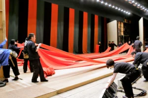 一つの舞台が終わった途端に、毛氈(もうせん)を片付ける人たち、