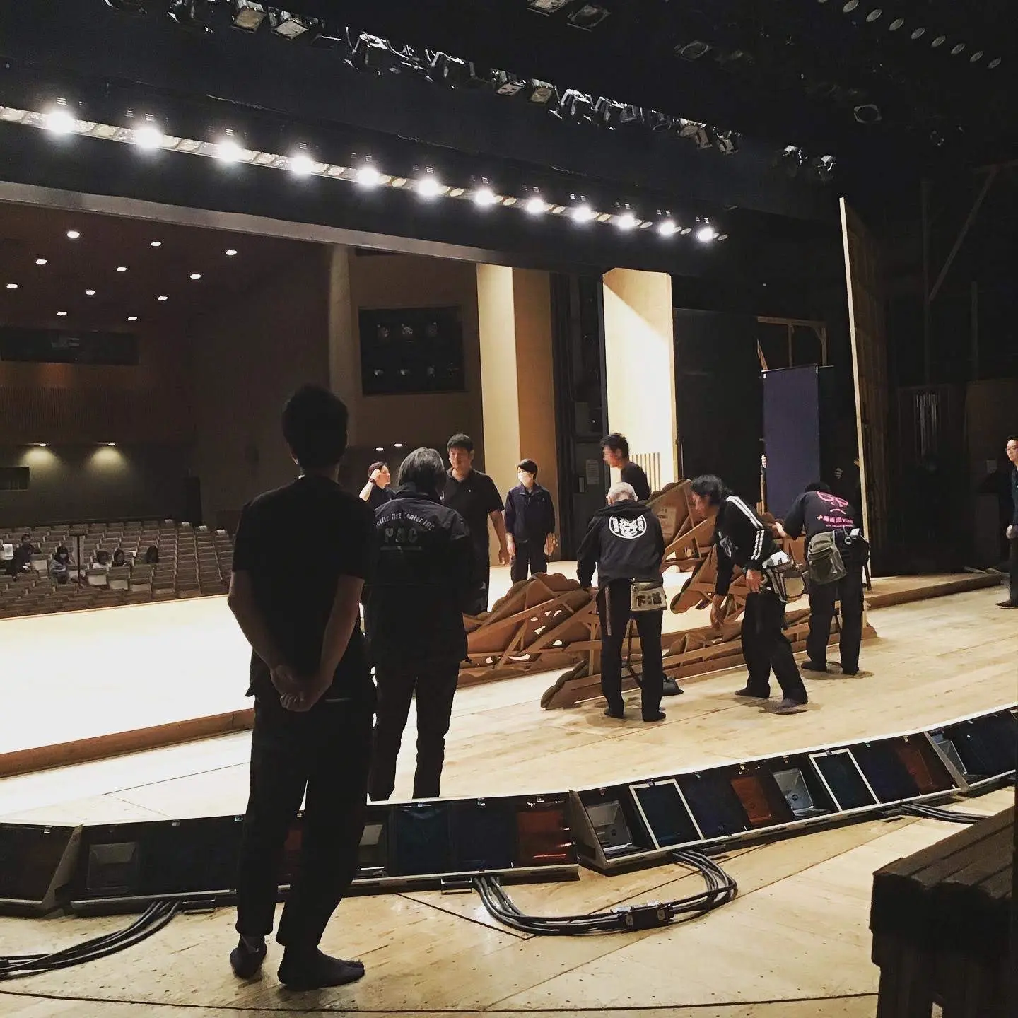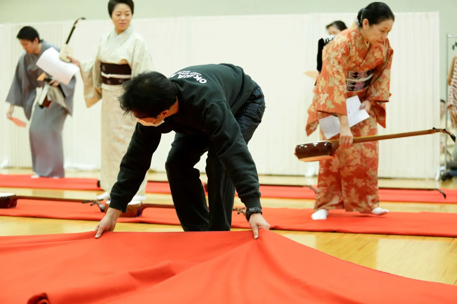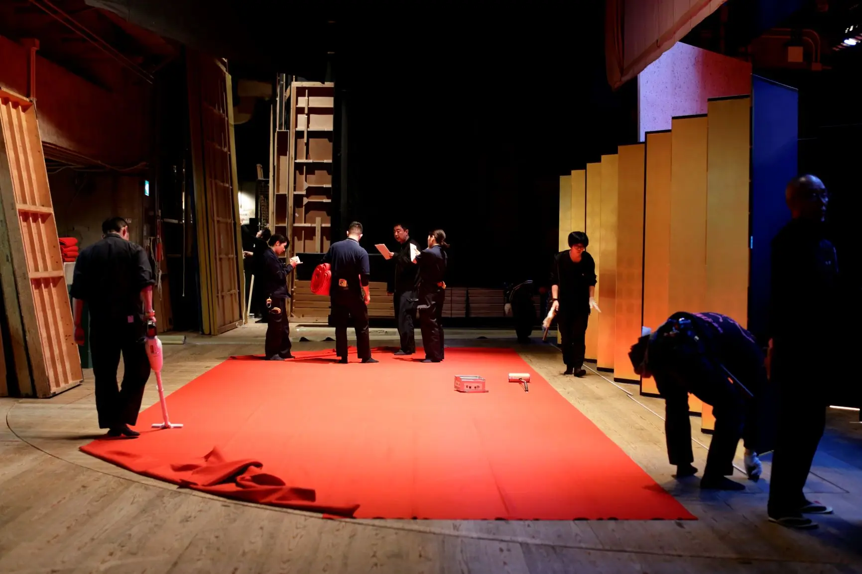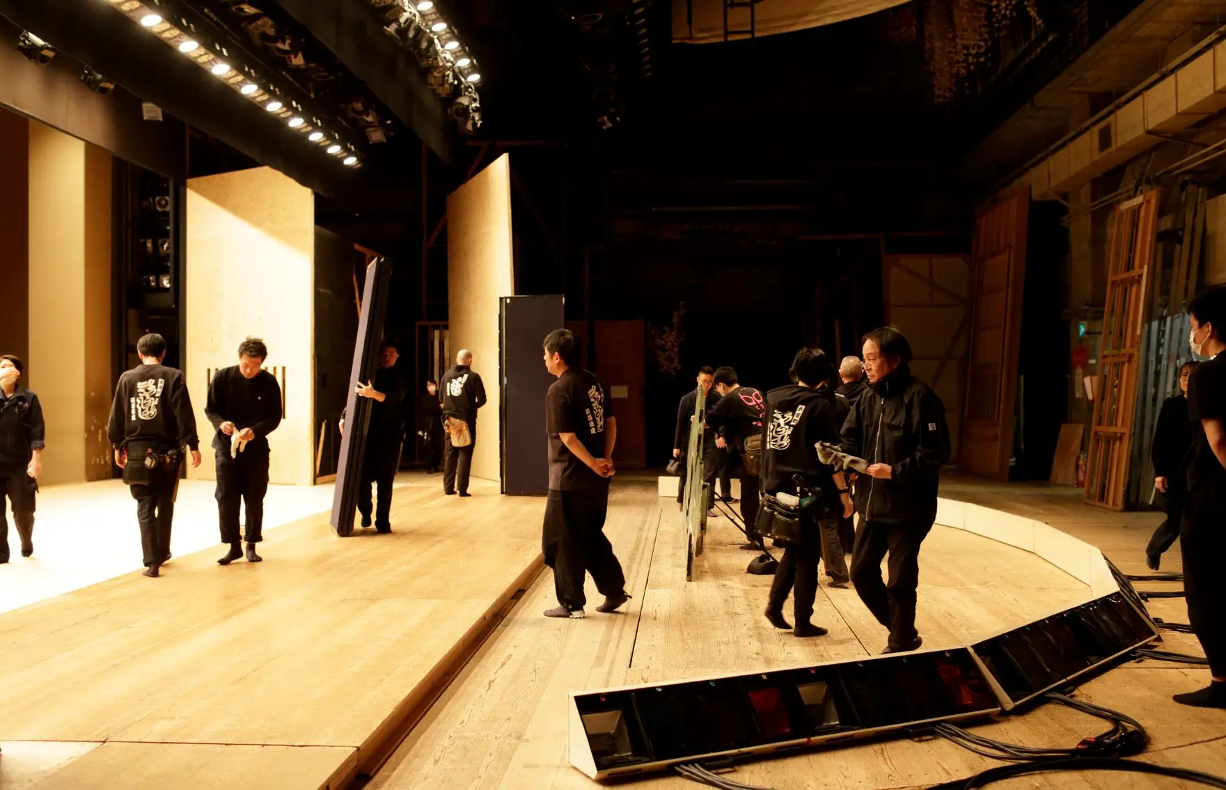 日本の伝統芸能に精通し、専門技術と知識、経験豊富な舞台スタッフ・岡田舞台の皆さん。背中のOKADA BUTAIが目印です。