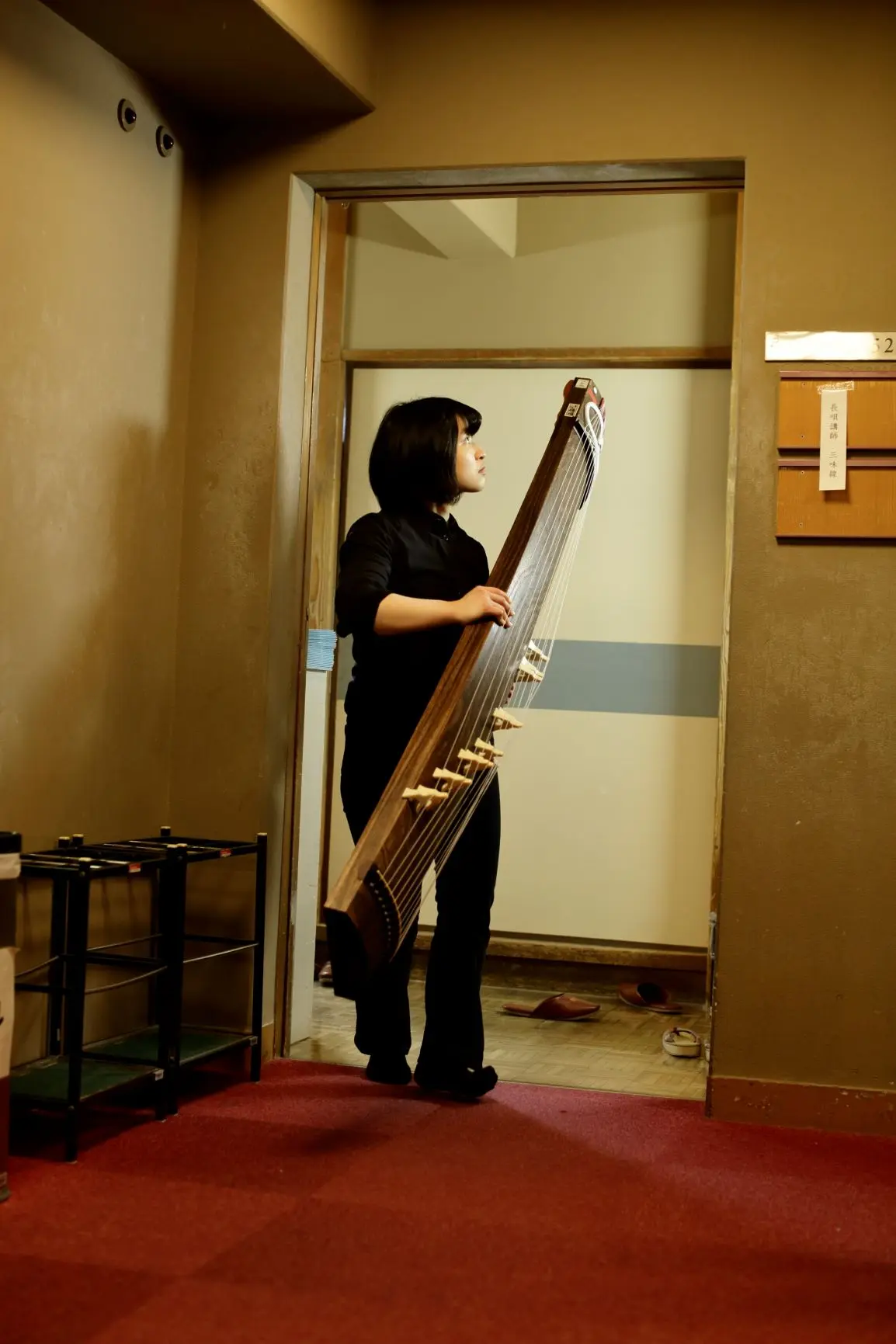 お箏の専門スタッフが移動、セッティングを担当。楽屋で調弦した楽器を一面ずつ丁寧に運びます。