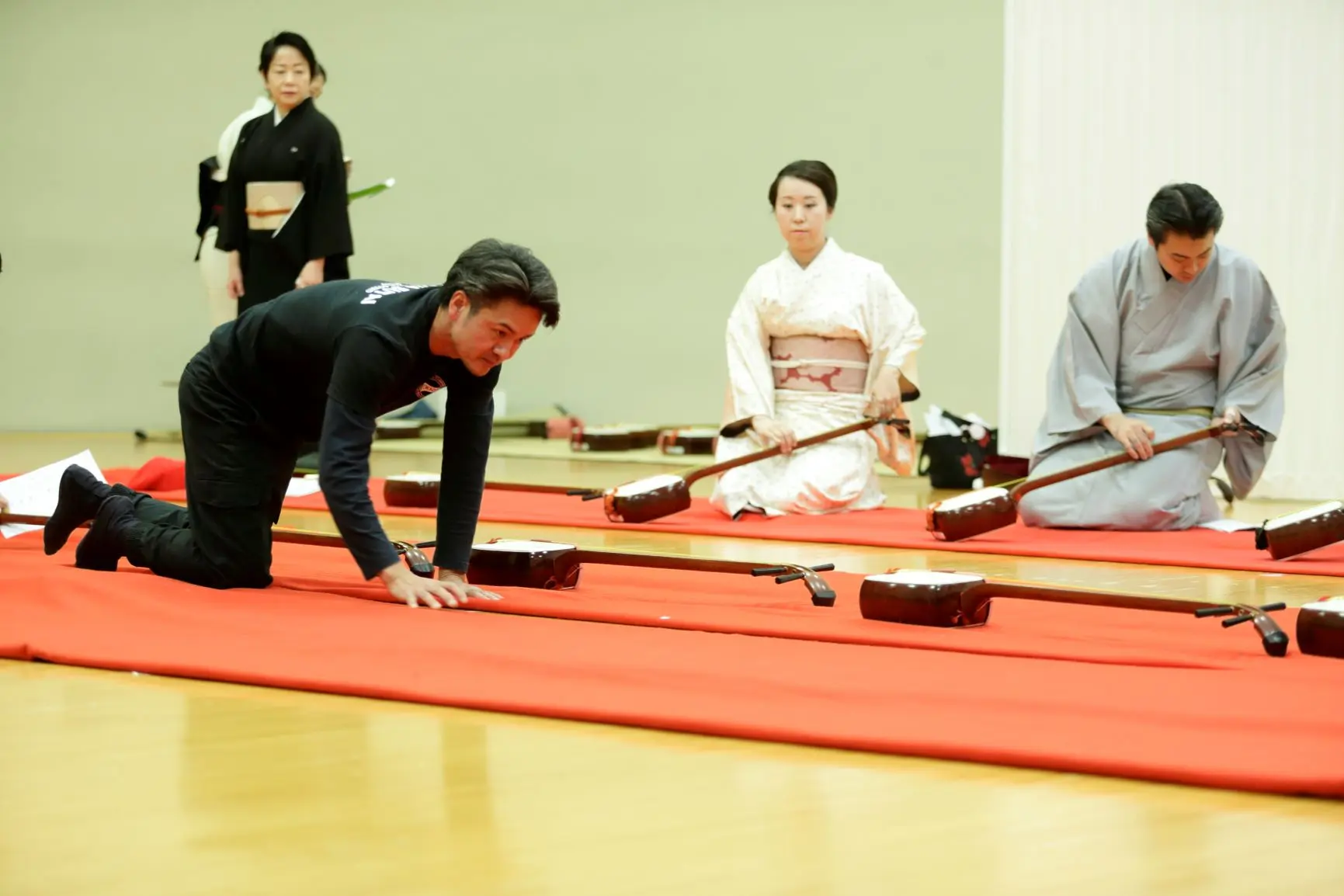 もちろんリハーサル室にも緋毛氈が敷かれます。長唄では、毛氈の下に長い座布団を敷きます。緋毛氈は舞台そのものを象徴します。