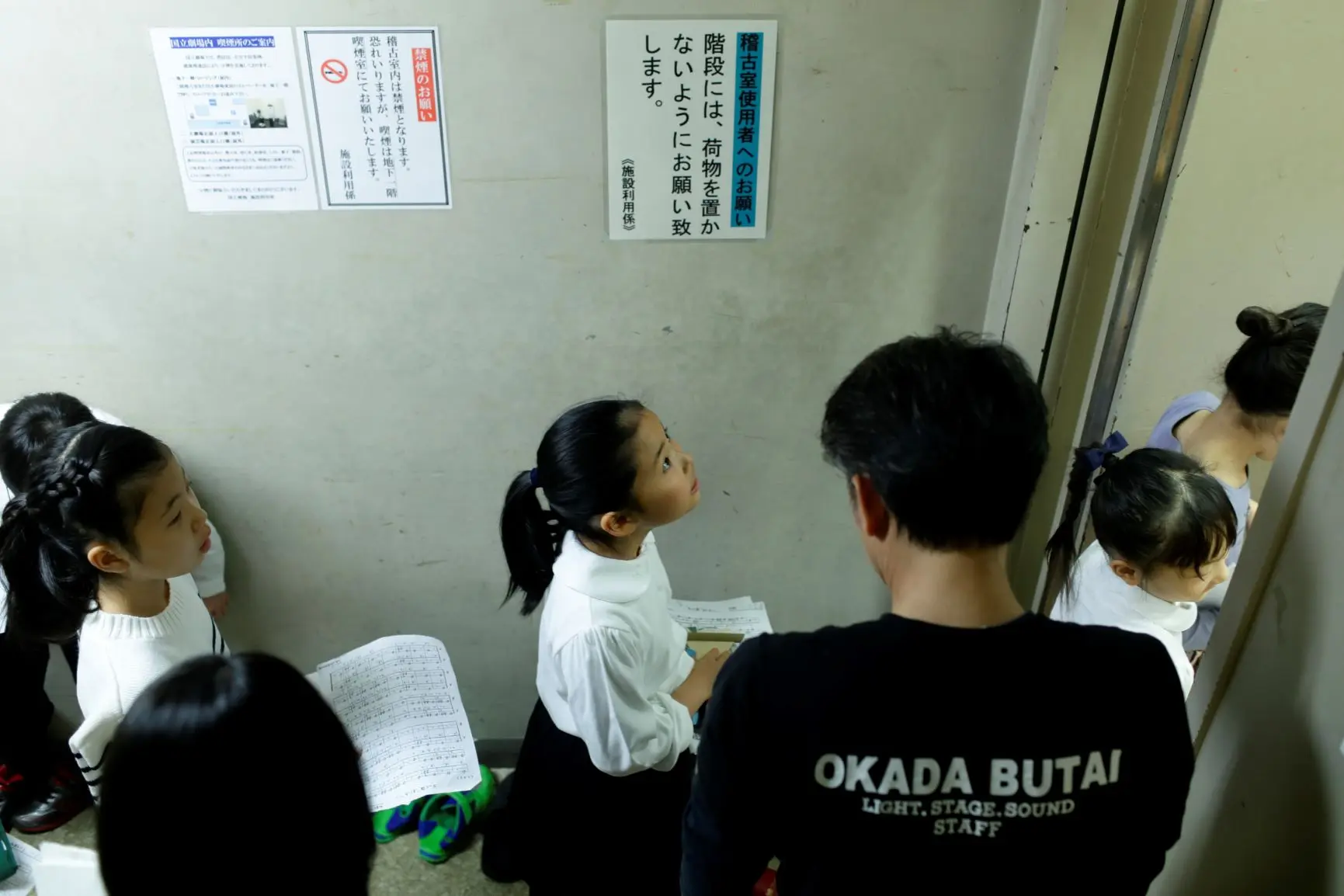 リハーサル室に子供たちがやってきました。慣れない緋毛氈や置いてある楽器につまずいたりしないよう、入り口で気を配る岡田さん。