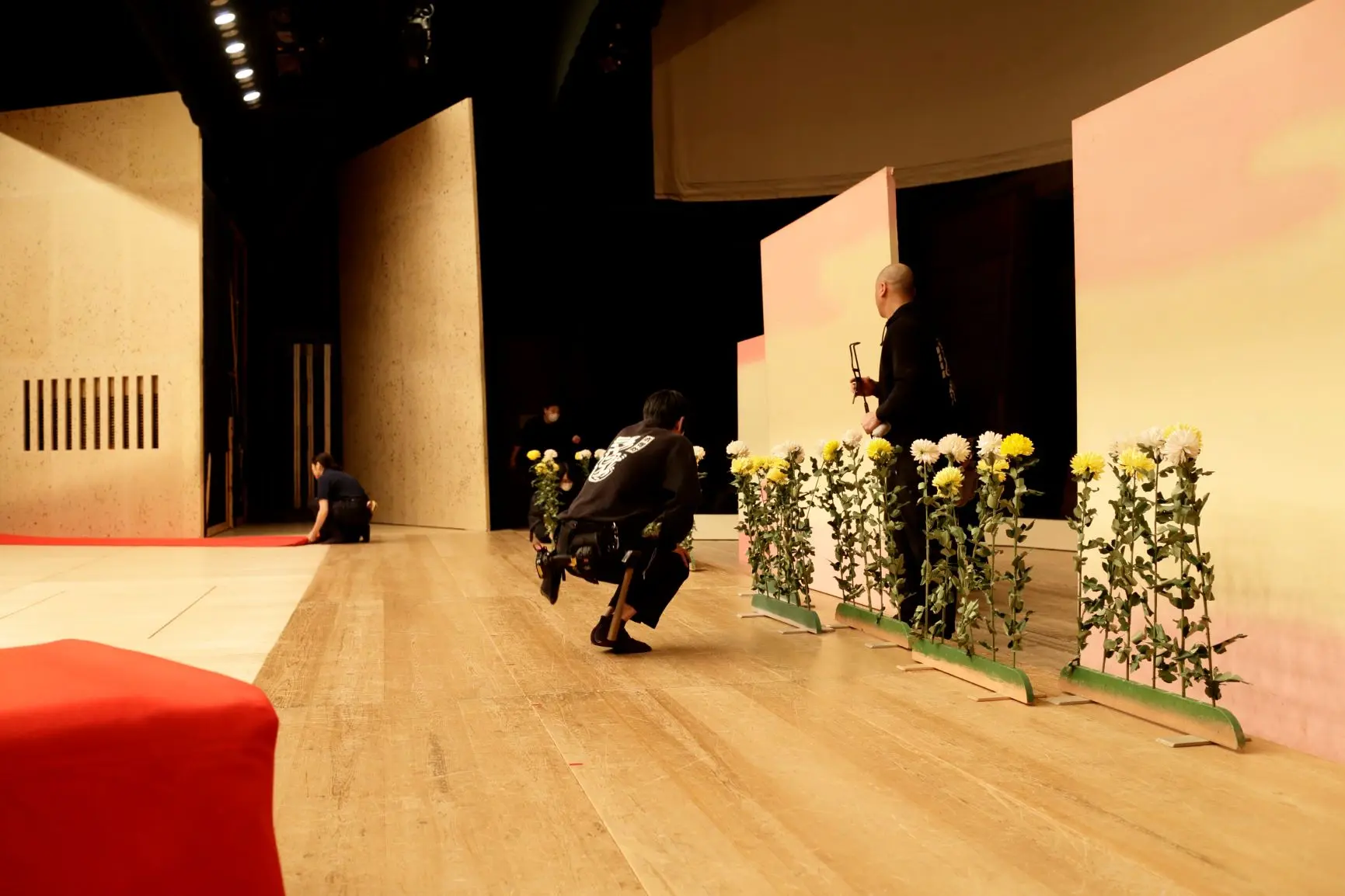 いよいよ、緋毛氈(ひもうせん)が敷き始められました。金屏風との取り合わせは、日本の伝統芸能の舞台のシンボルです。