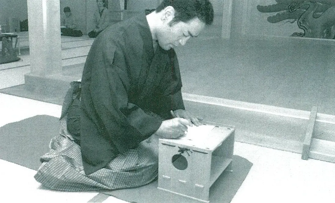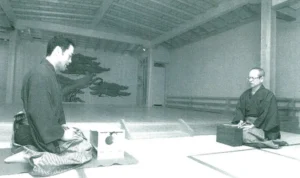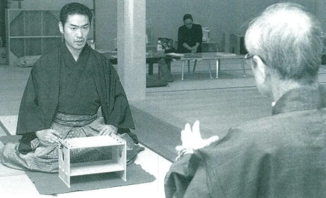 photo: 若き頃の深田先生。師匠からお稽古をつけてもらう(於:野村万作家稽古舞台)