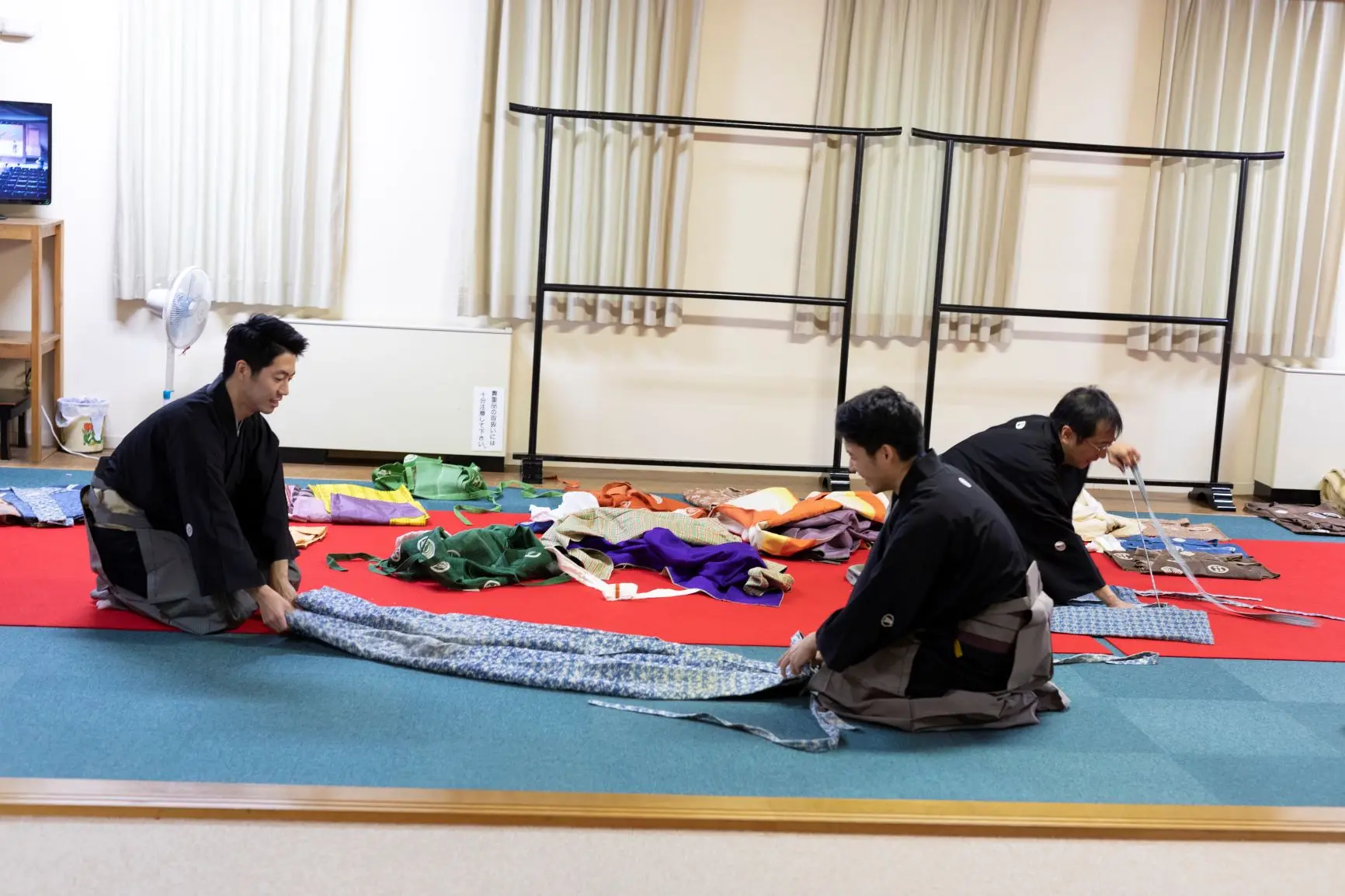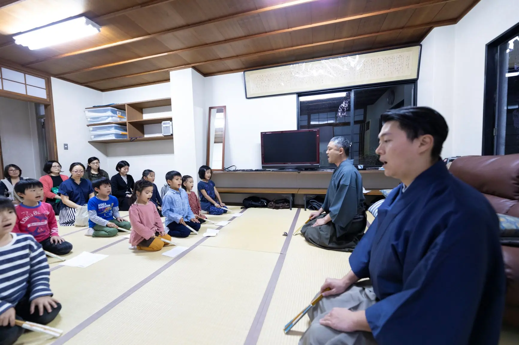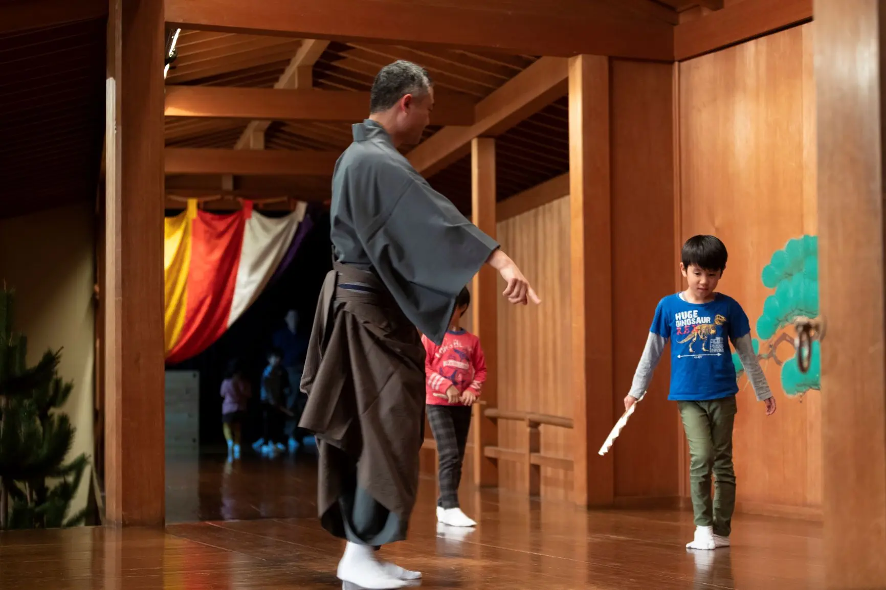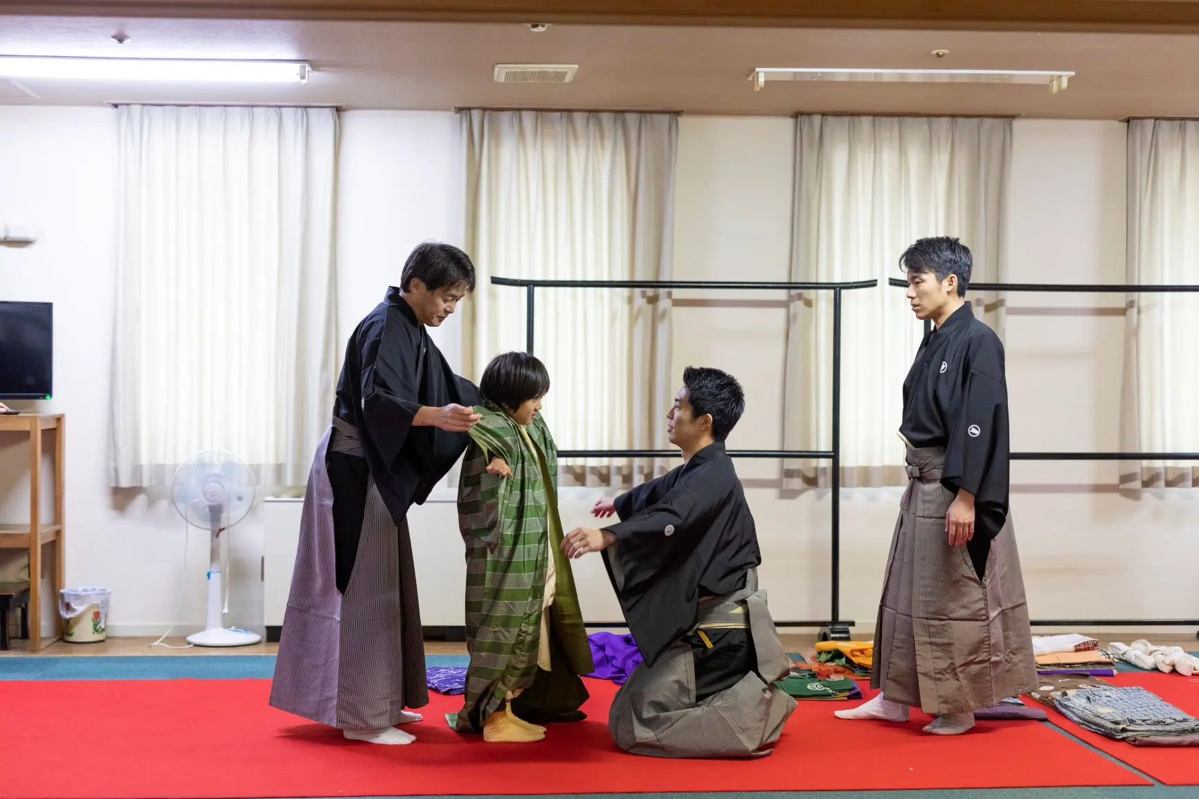 お稽古と発表会を支える先生方② 稽古場~宝生能楽堂 2020.05.01 コラム 能楽は、梅若能楽学院会館でのお稽古でした。 広い和室や、本物の能舞台を使って。 声の出し方、からだの動き。 申合せ(リハーサル)と本番では、装束のお針子仕事も! 子供一人ずつに着付けをして下さるのも先生方。 竹竿で揚幕の上げ下げ、切戸口の開け閉めも。 時にきびしい指導もありましたが、発表会を終えた子供たちの嬉しそうな顔に先生方もニコニコでした。 撮影:菅原康太