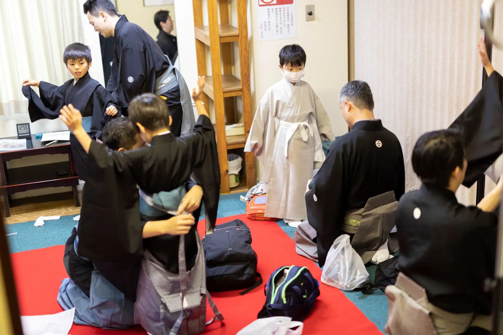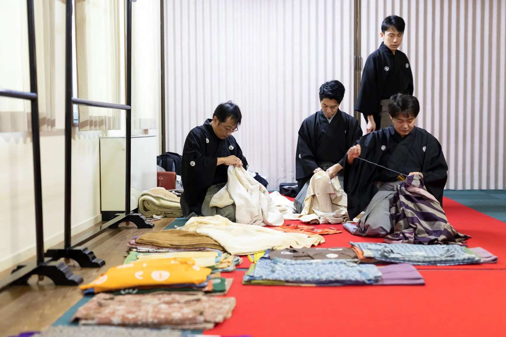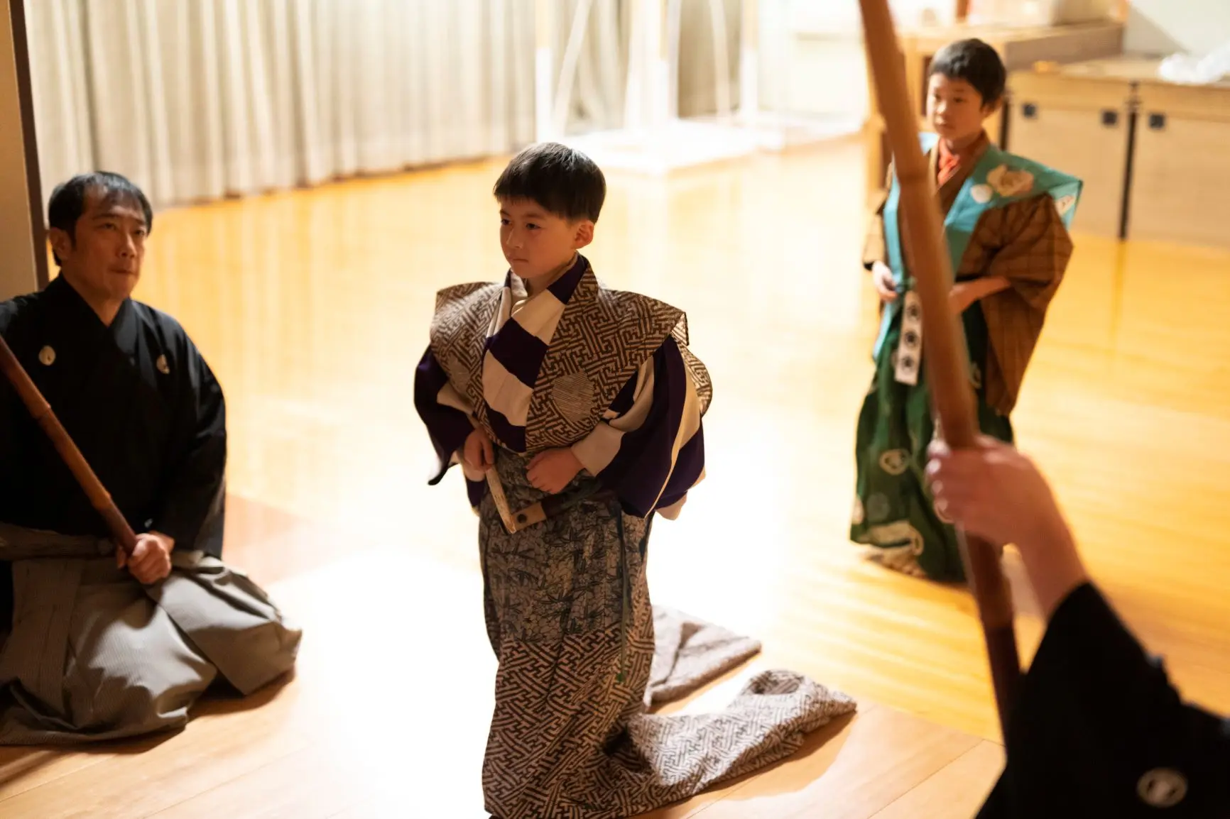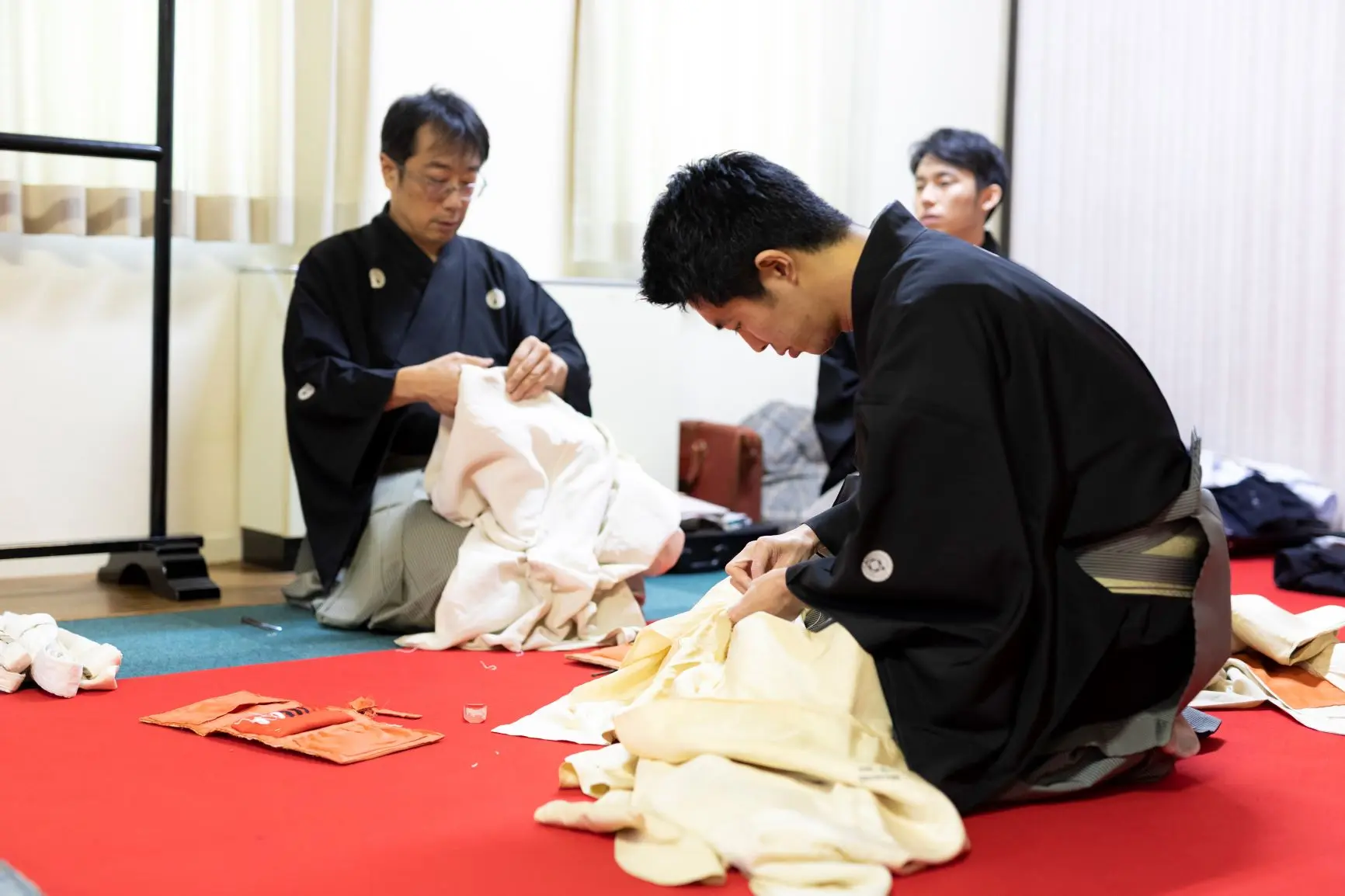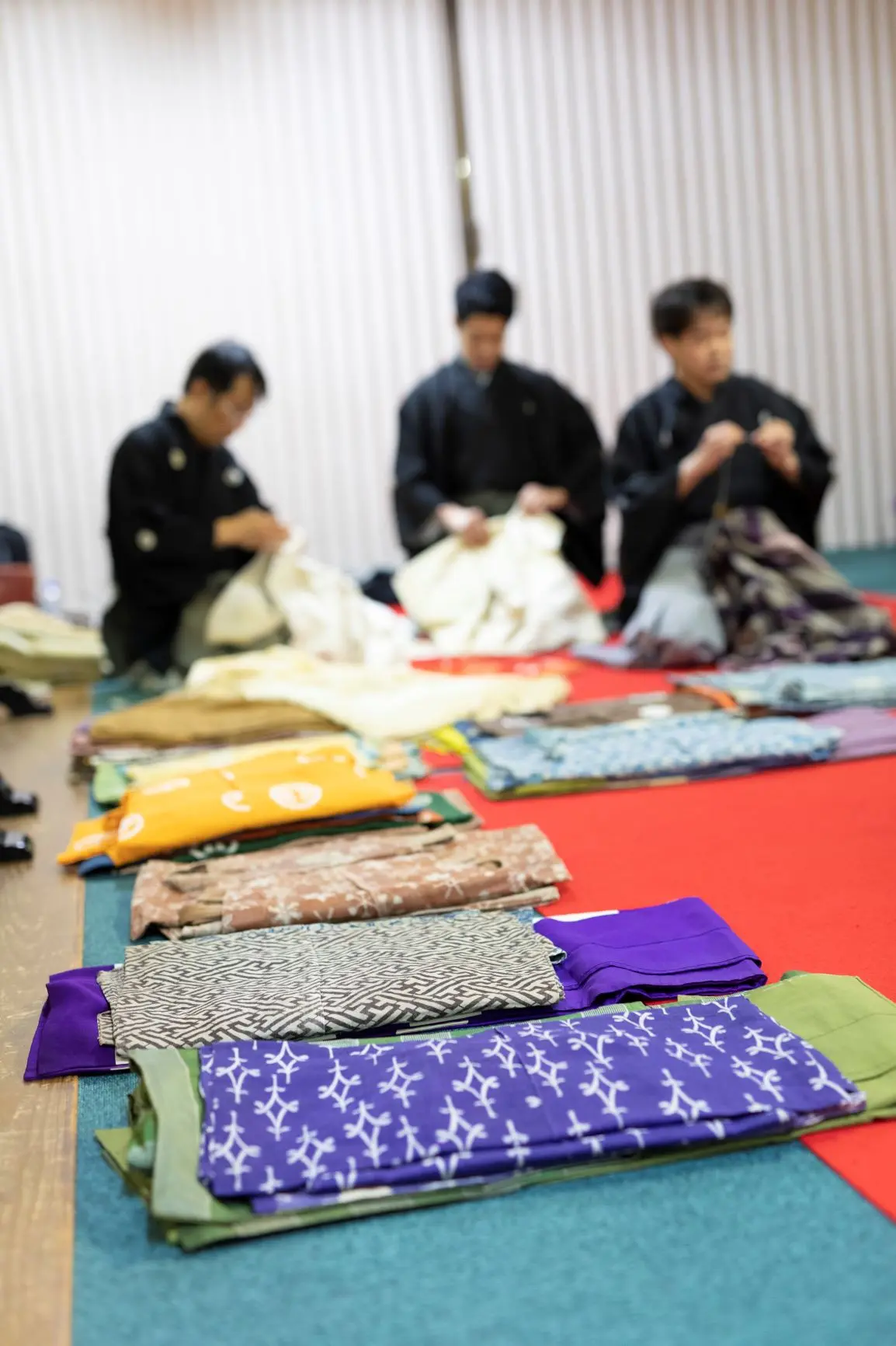 お稽古と発表会を支える先生方② 稽古場~宝生能楽堂 2020.05.01 コラム 能楽は、梅若能楽学院会館でのお稽古でした。 広い和室や、本物の能舞台を使って。 声の出し方、からだの動き。 申合せ(リハーサル)と本番では、装束のお針子仕事も! 子供一人ずつに着付けをして下さるのも先生方。 竹竿で揚幕の上げ下げ、切戸口の開け閉めも。 時にきびしい指導もありましたが、発表会を終えた子供たちの嬉しそうな顔に先生方もニコニコでした。 撮影:菅原康太