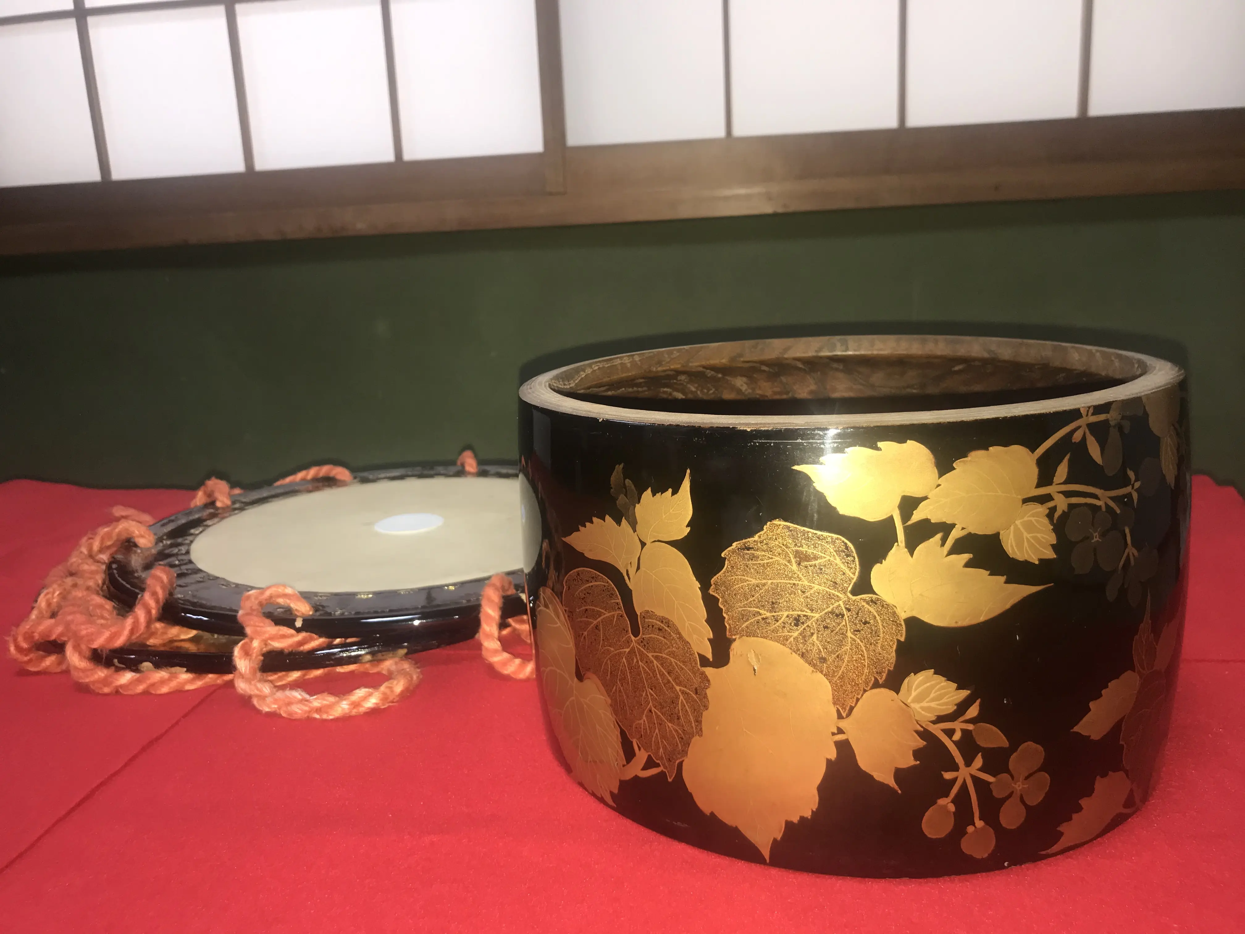 邦楽囃子方は、笛を専門に演奏する笛方以外は、小鼓だけでなく大鼓や太鼓、さらに蔭囃子(かげばやし…歌舞伎などの舞台で、お客様からは見えない黒御簾という場所で演奏する囃子)で使うすべての打楽器を演奏できなければなりません。初舞台で使わせていただいた太鼓を、5年前に私の先生が亡くなったあと、ご遺族と先輩のご厚意でお譲りいただきました。胴といって二枚の皮にはさまれたところには、漆を塗った上に美しい金蒔絵がほどこされています。