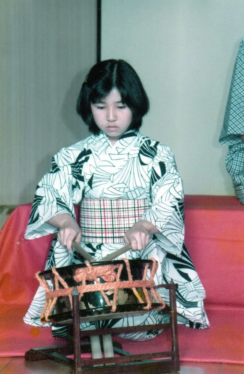 中学3年生のとき、よく見ていた邦楽番組でたまたま小鼓の特集があり、「これ、かっこいい!」と思いました。楽器そのものに魅せられたのか、今思えば、そのとき演奏していた方がかっこよかったのか・・・・・・。父の知人に先生を紹介していただきました。先生のお宅がバスで3停留所という近さだったのもご縁があったのだと思います。