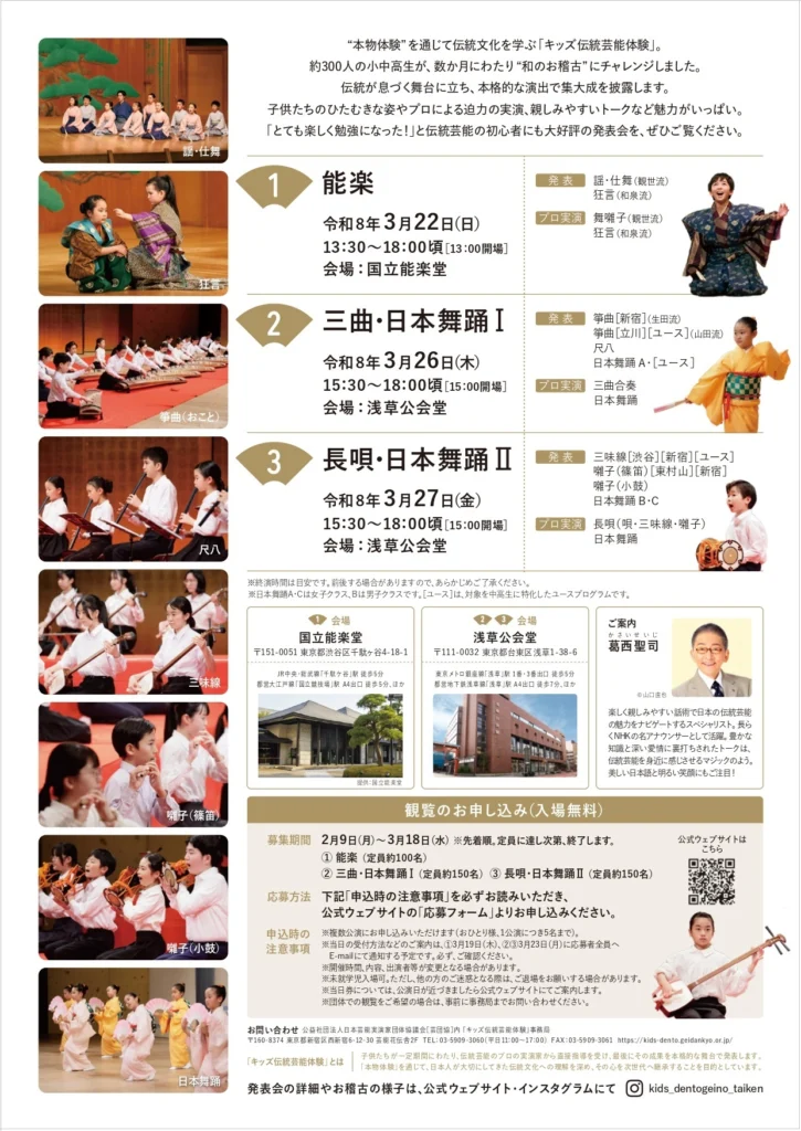 *当日の受付方法などのご案内は、①[能楽]は3月19日(木)、②③[三曲・日本舞踊Ⅰ][長唄・日本舞踊Ⅱ]は3月23日(月)に応募者全員へE-mailにて通知する予定です。必ず、ご確認ください。