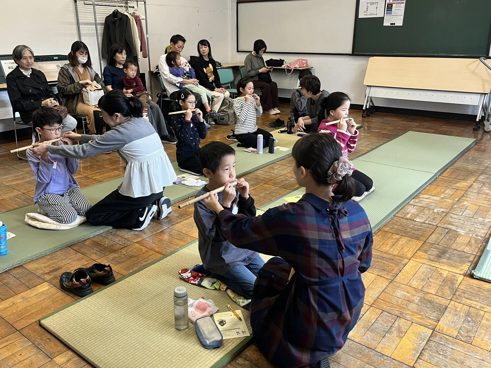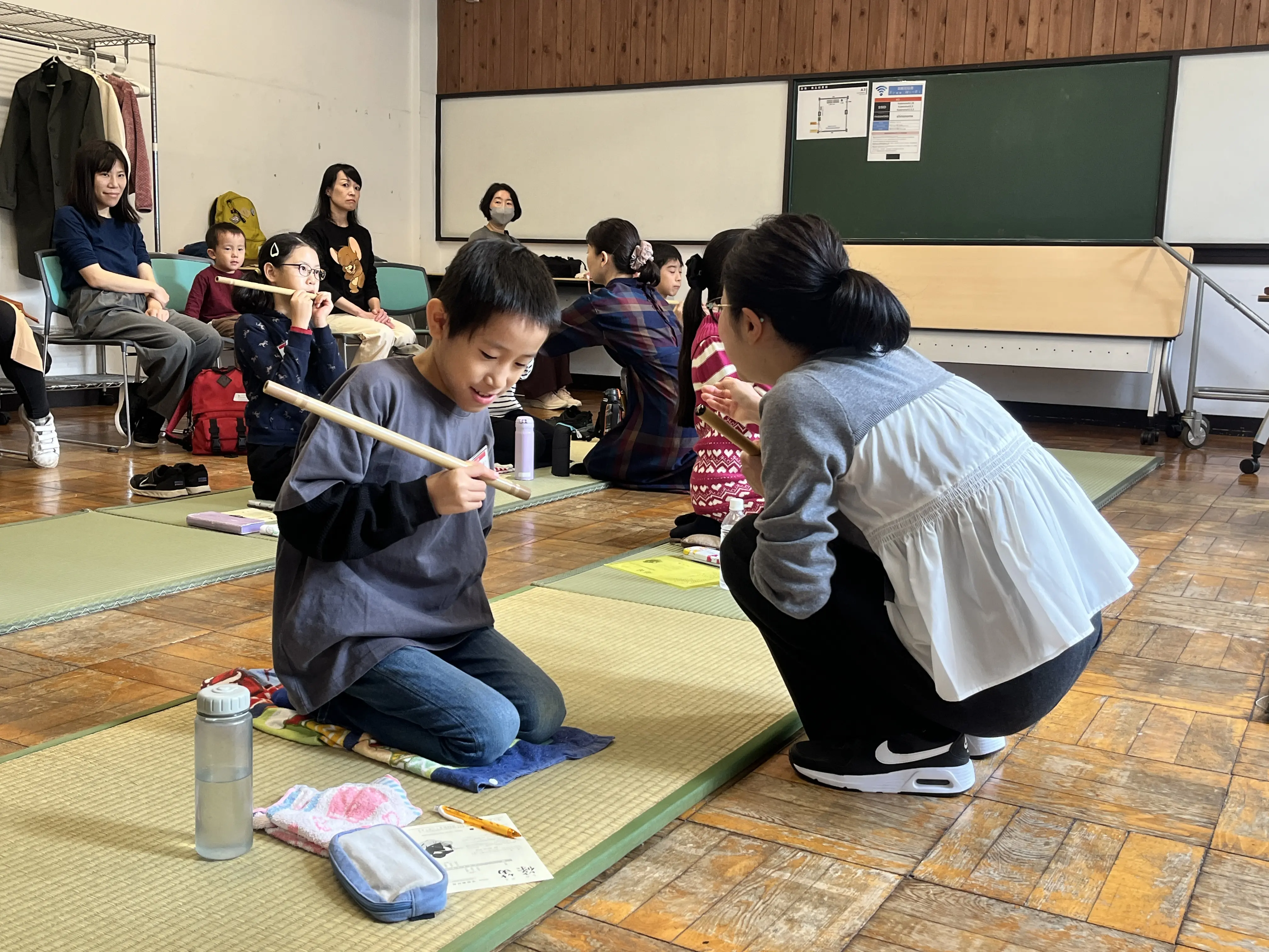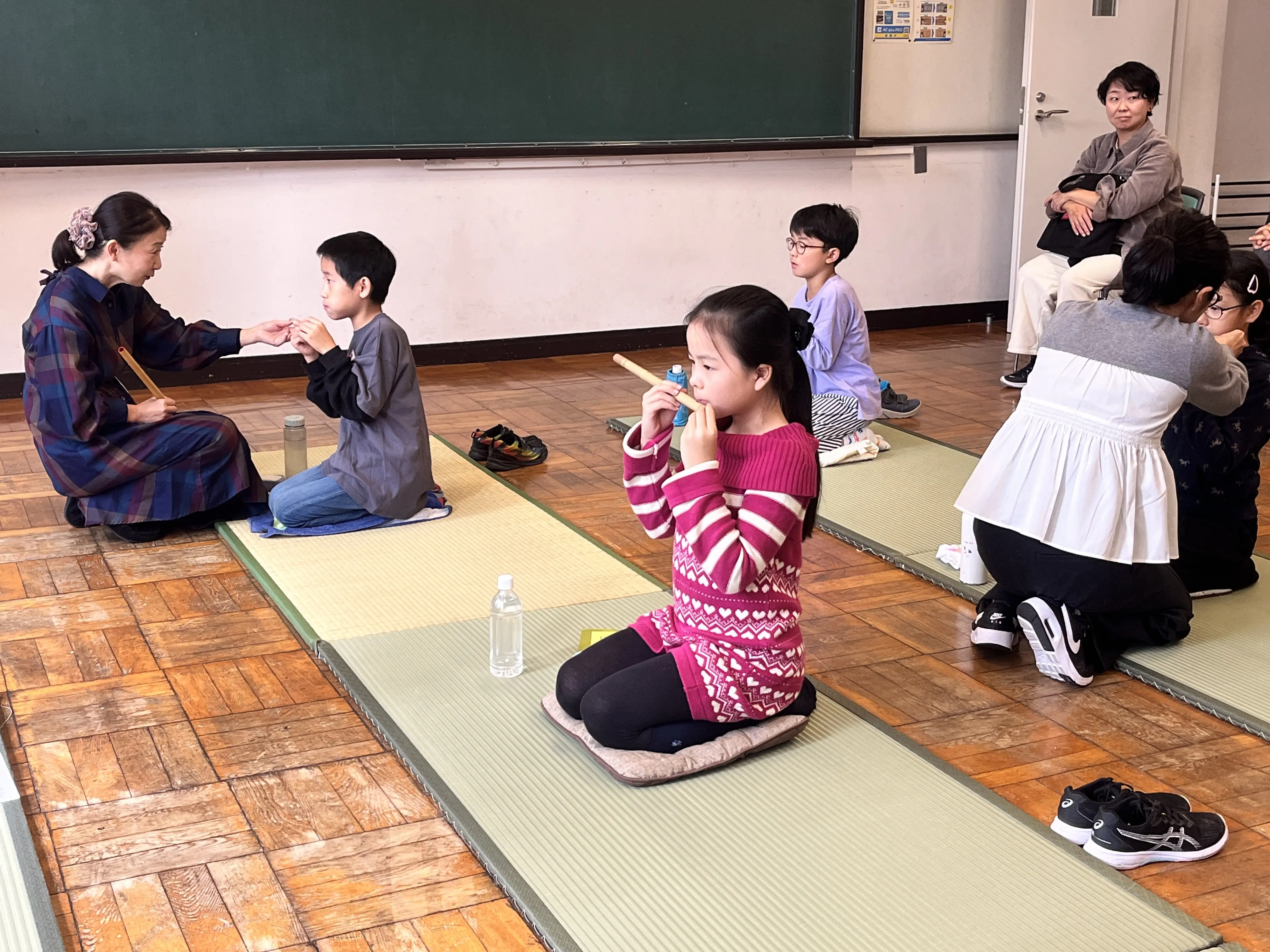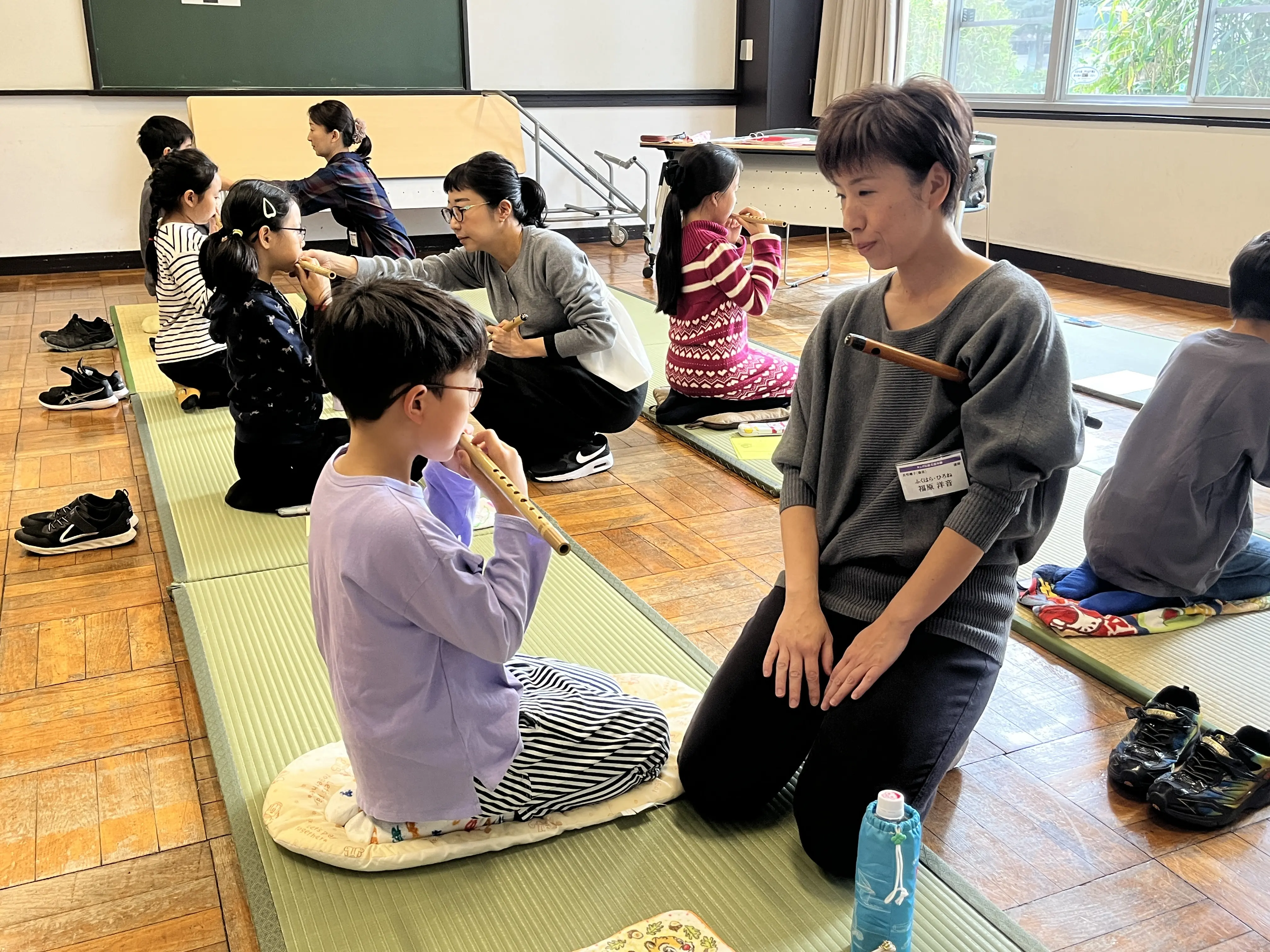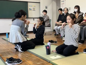 まず音を出すことが難しいのが篠笛という楽器。3人の先生にひとりずつ、口の形や笛の高さをチェックをしてもらいながら息を吹き込んでみます。