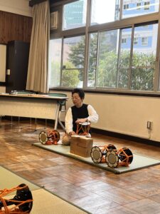 先生が小鼓を分解して、2枚の皮と胴、そして調べ(オレンジ色の紐)という紐でできていることを説明してくれました。