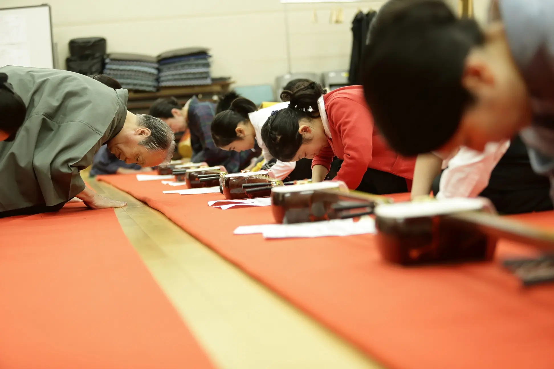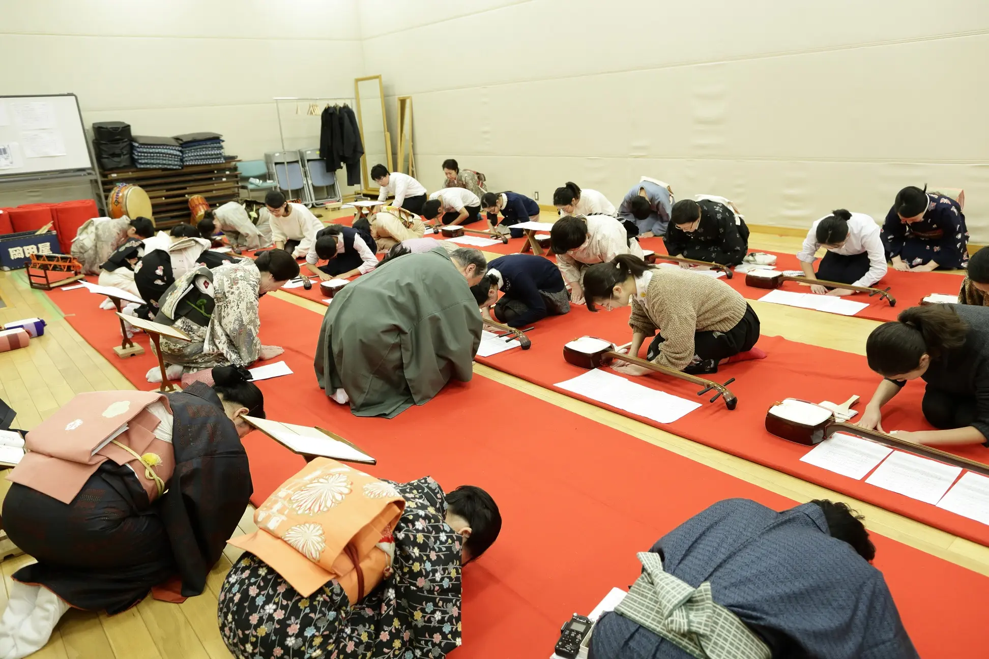 先生方は、舞台で使う何挺(ちょう)もの三味線を手早く準備しながら、
