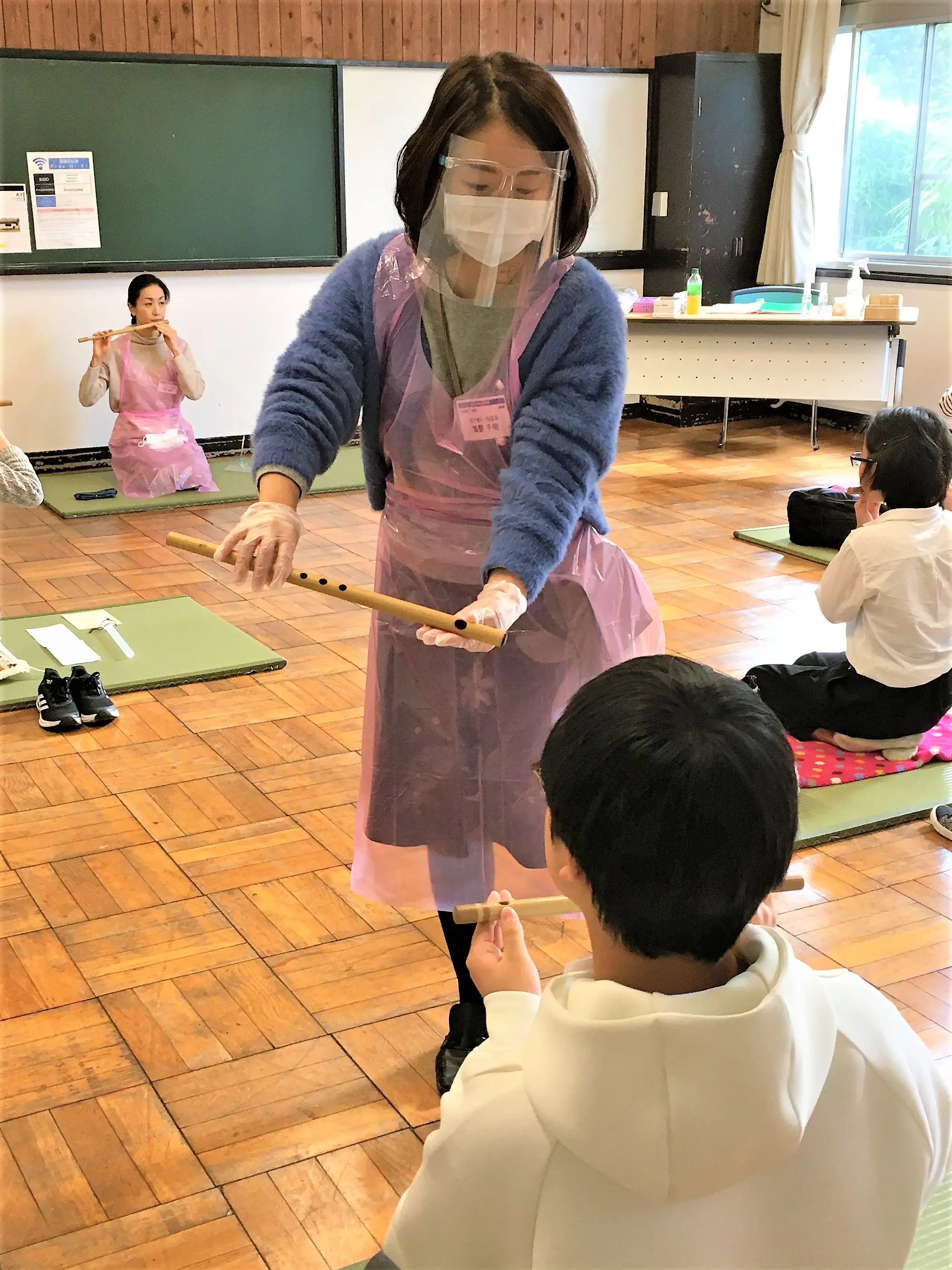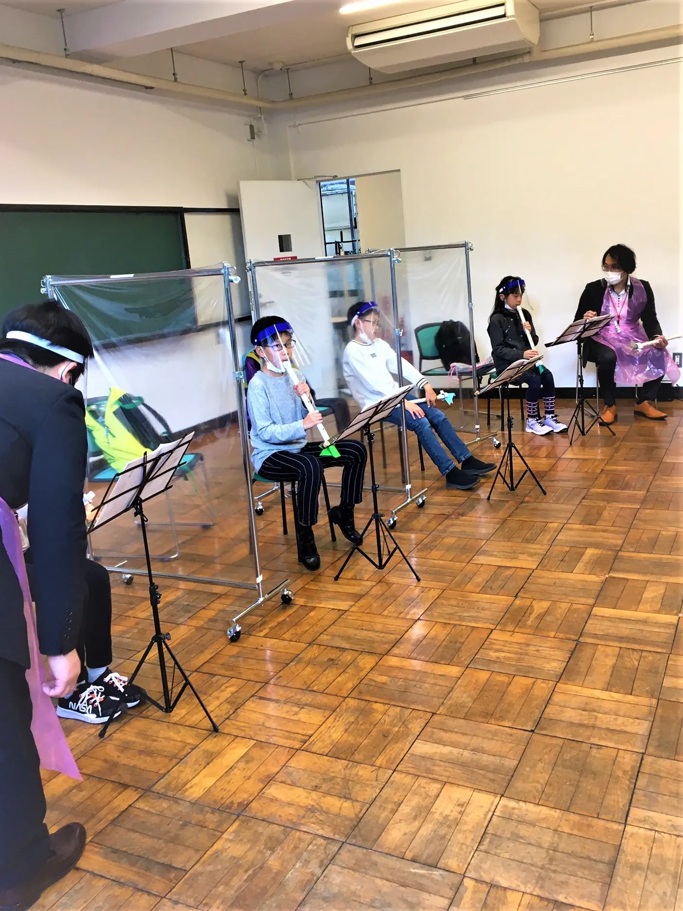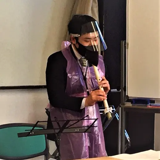 先生方は、マスクとフェイスシールド、ゴム手袋、アルコールが必須アイテム。もちろん検温と徹底した手洗いも指導項目の一つです。アクリル板やビニールの仕切りも大活躍。尺八や篠笛では管楽器用の特別マスクも活用しています。