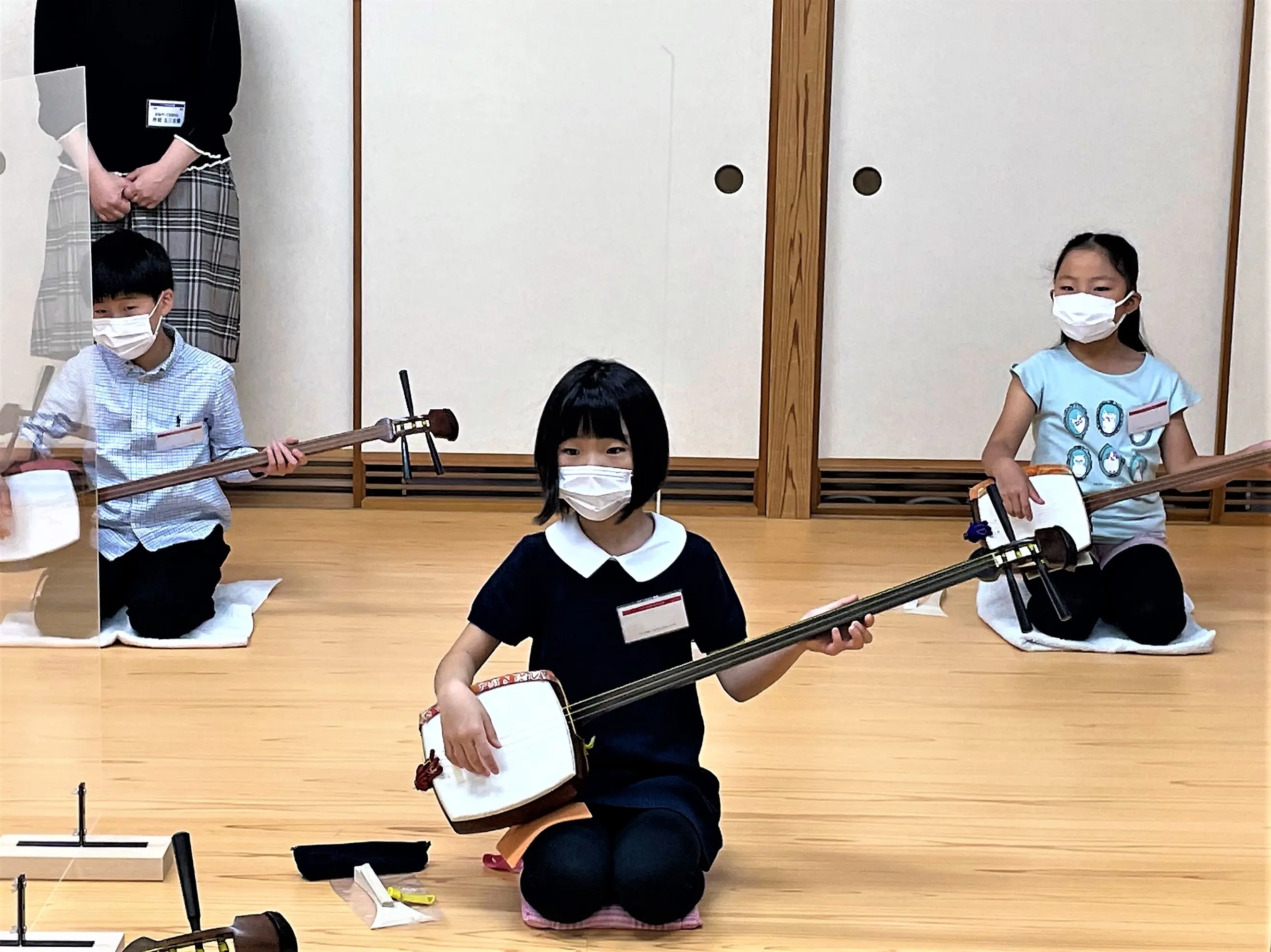 三味線屋さんがカラフルに取りそろえてくださったので、子供たちは少し考えながら自分の好きな色を選んでいました。