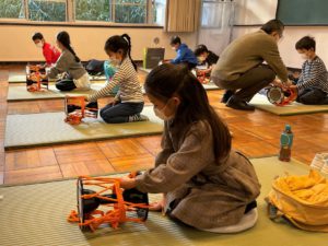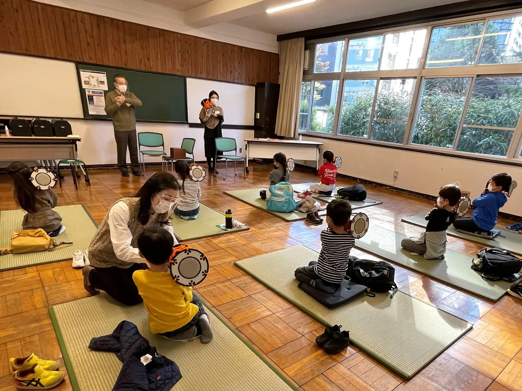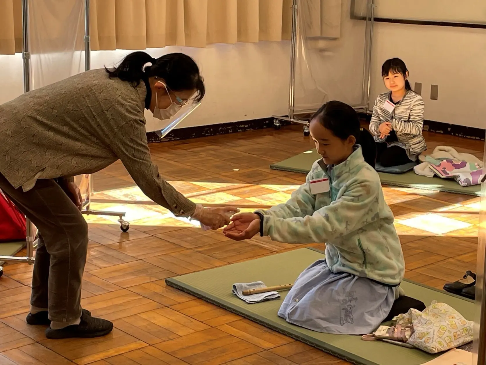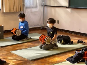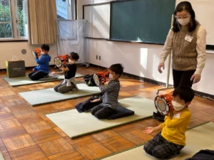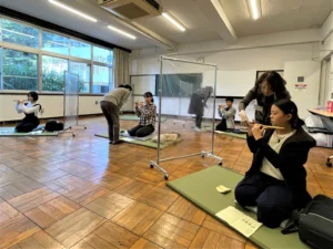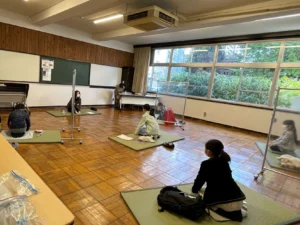 教室には人数分の畳(たたみ)を敷いて、ソーシャルディスタンスを確保。