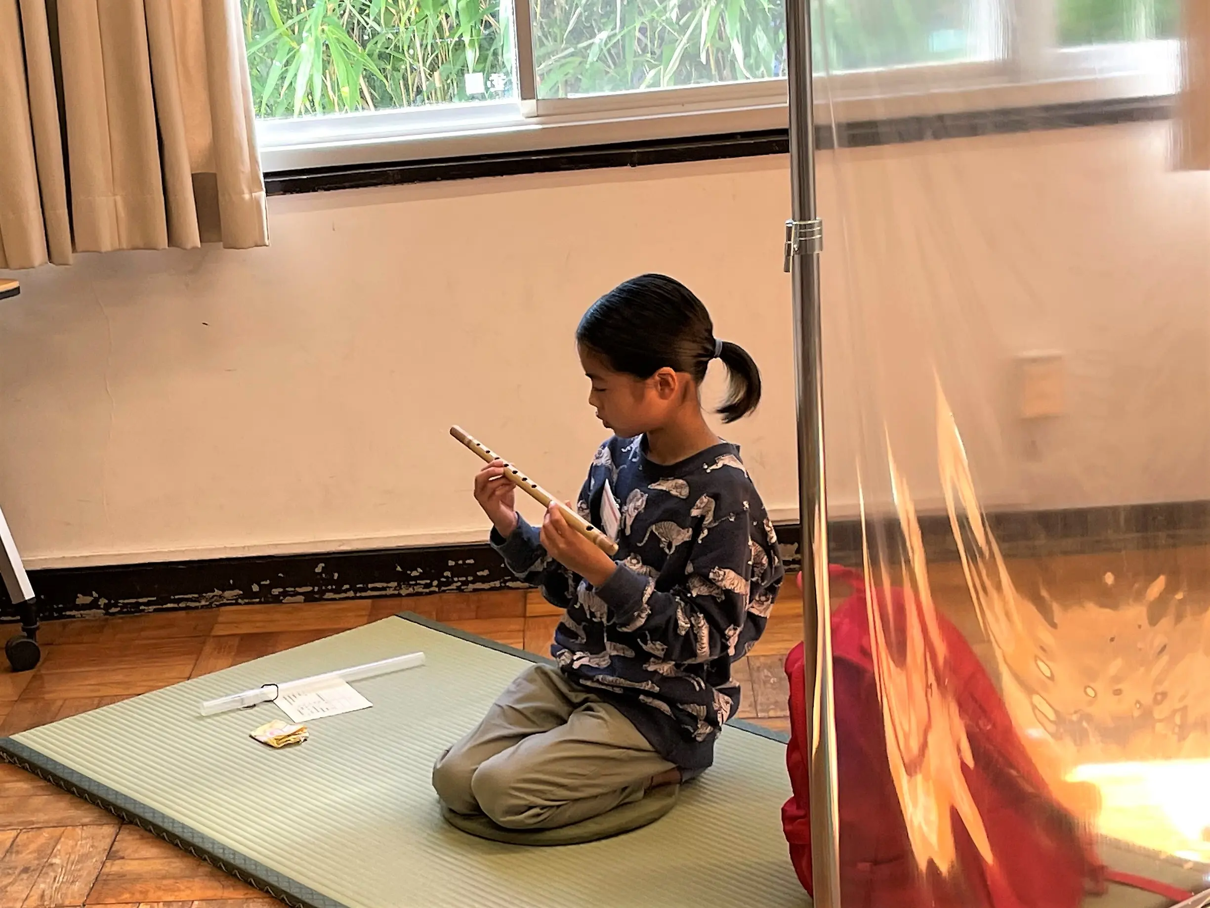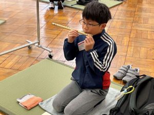囃子のなかで篠笛はメロディ―、小鼓はリズムを担当します。午前中は篠笛コースです。