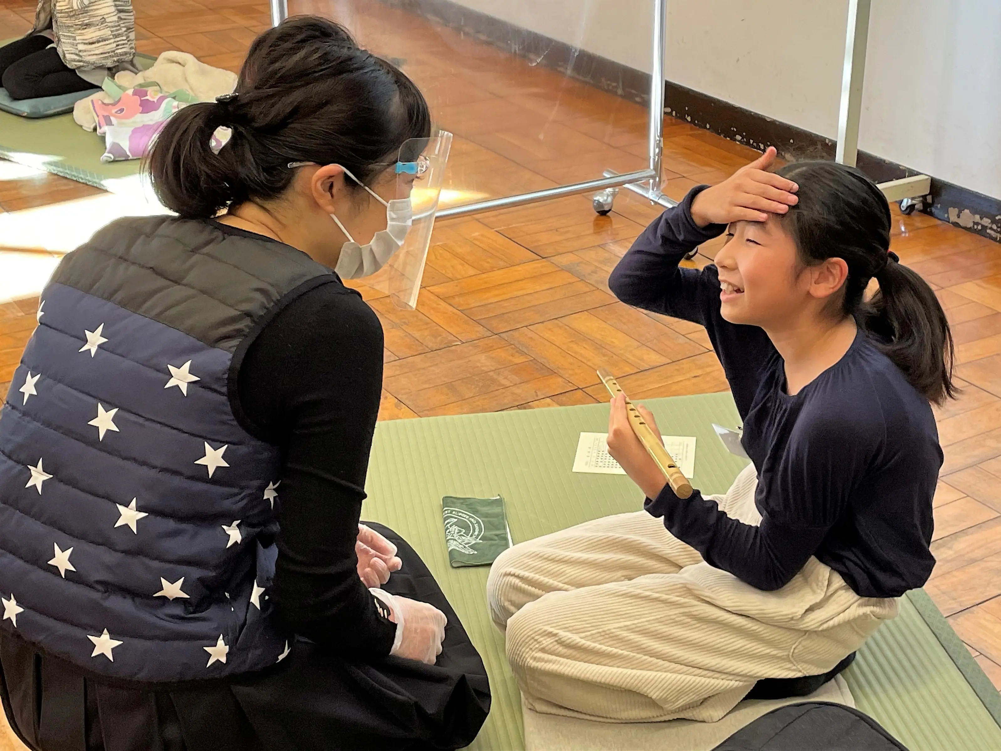 まずは音を出してみます。先生が、丁寧に口の形や角度のコツをアドバイス。