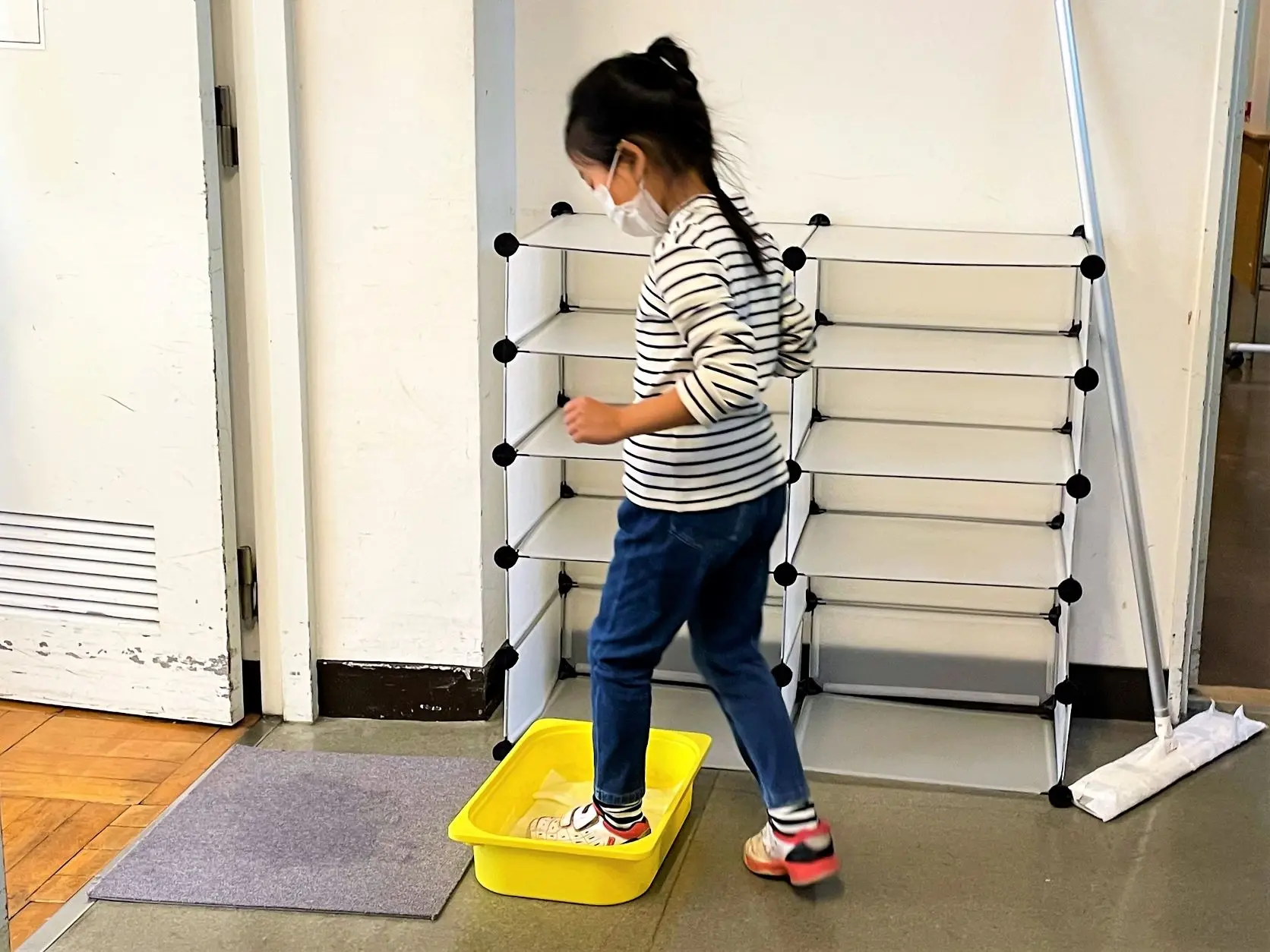 囃子のコースは、教室に入る前にトレイのなかで軽く足踏み。靴底も消毒しています。