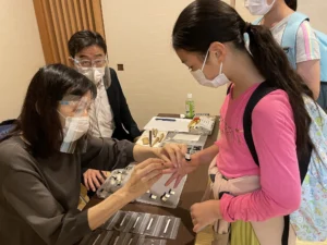 例年、箏曲のお稽古は、畳(たたみ)のお部屋に入る前に、床に手をつき、先生とご挨拶を交わすところから始まりますが、いまは感染症対策のため、立ったまま一礼します。