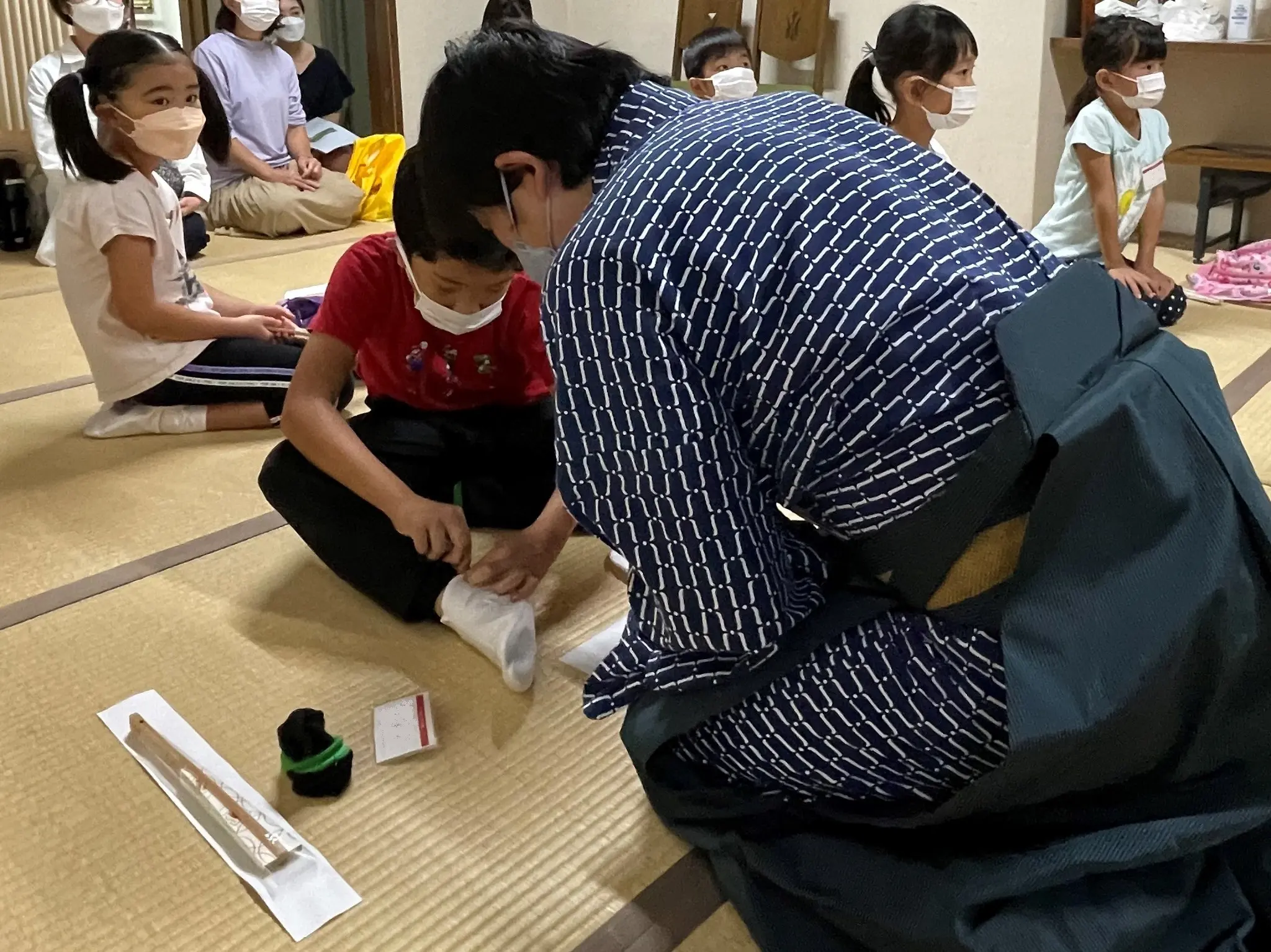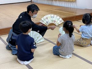 足袋の履き方を教わり、一人ひとりに扇が配られました。