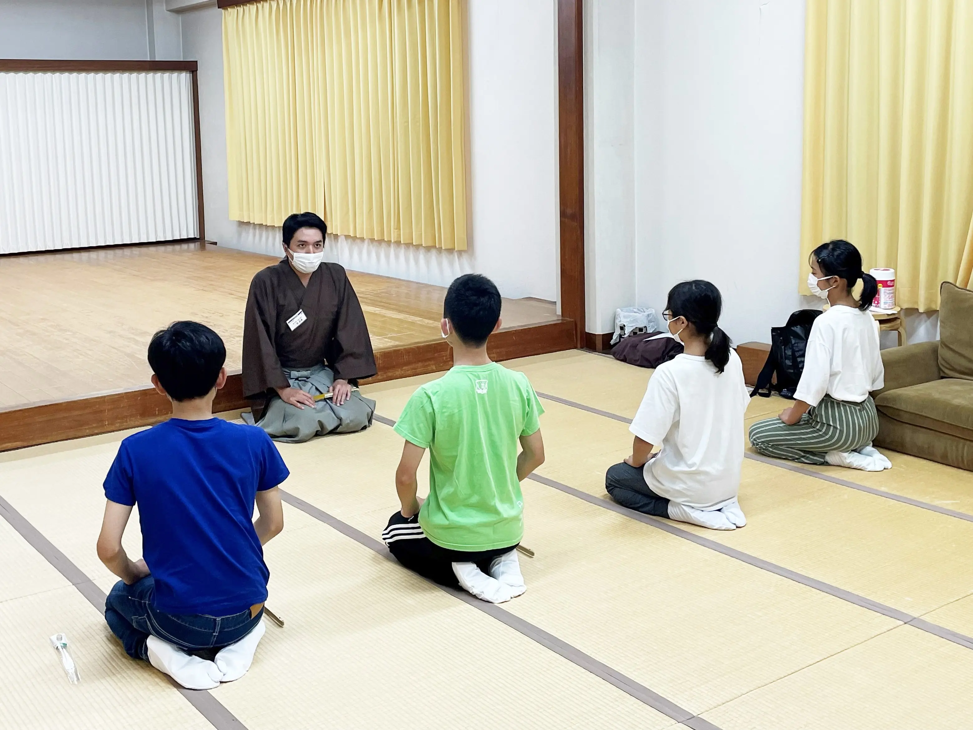 狂言コースでも扇が配られ、開いてみたり、閉じてみたり。続いて、すり足を教わりました。これら一つひとつに作法があり、単純に見えても簡単ではありません。あいさつや基本の構えをしっかりと学んだうえで、型に沿った動きや独特な言葉づかいを覚えていきます。