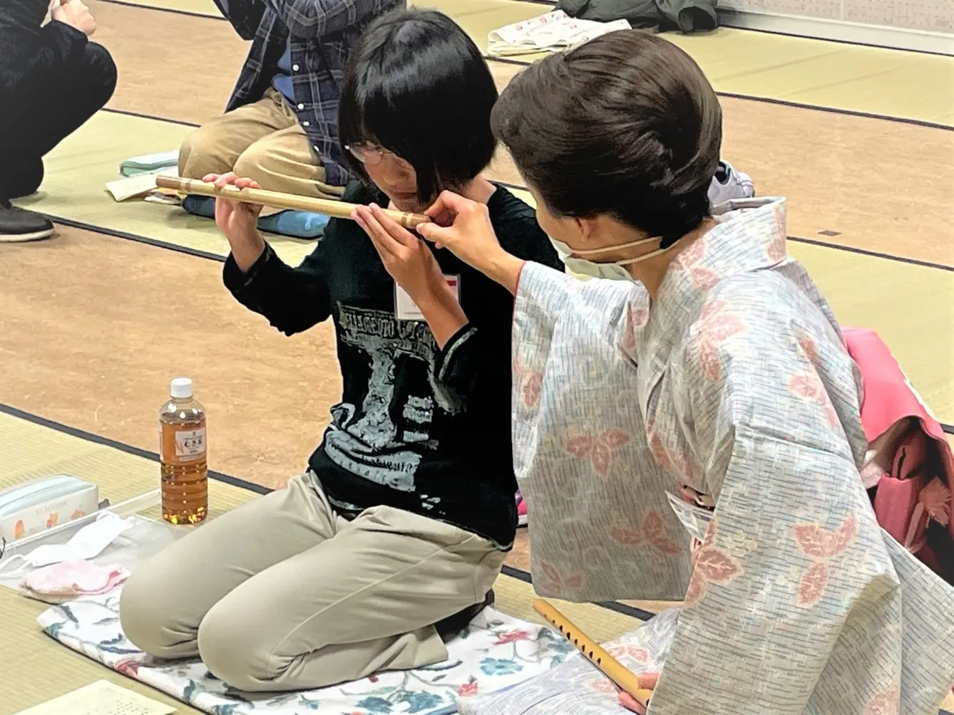 「篠笛をすっと持ち上げて、ちょうど口の位置に合わせるのが大変です」「それは慣れなので繰り返し練習することですね」