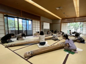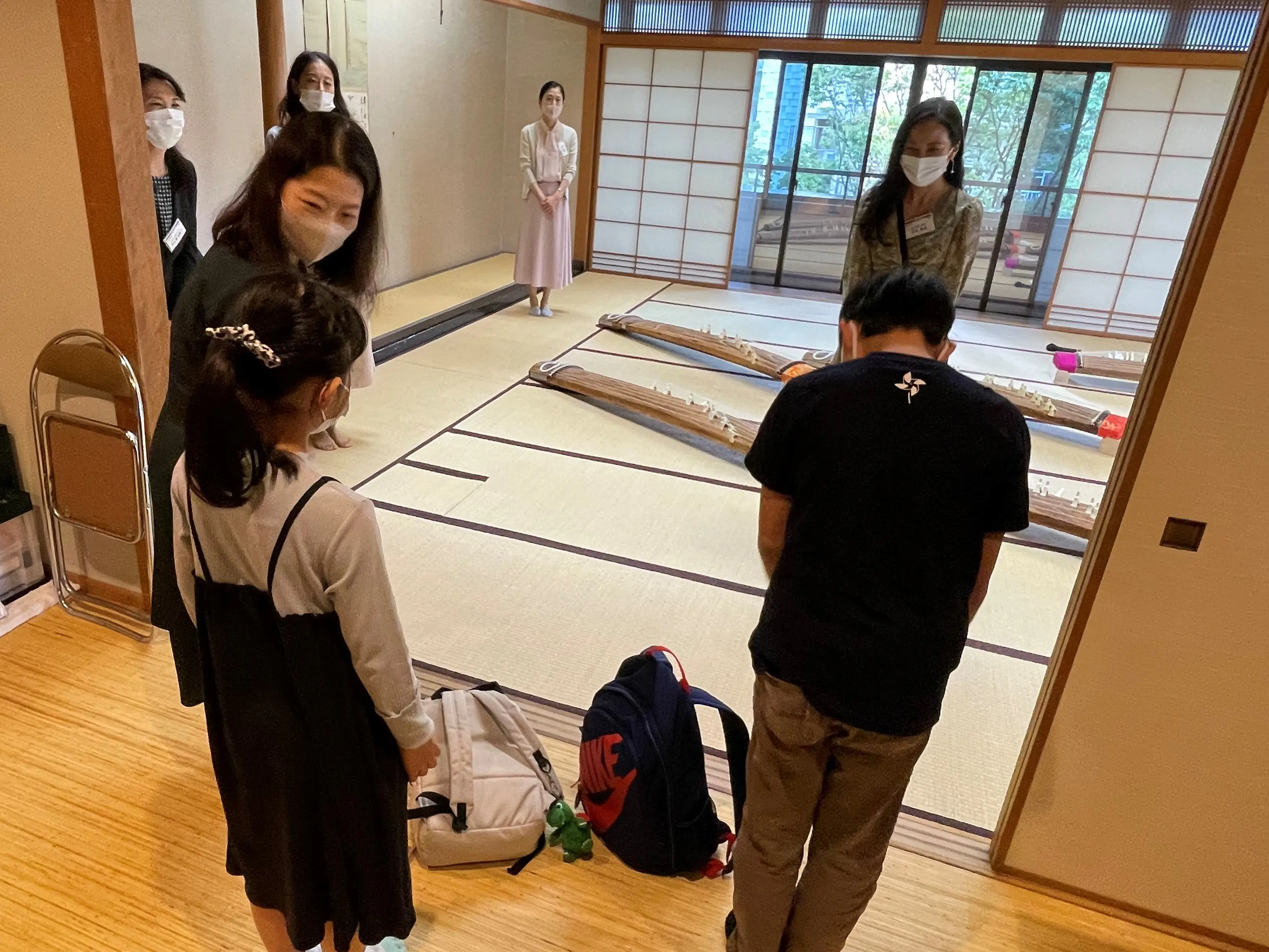 箏曲のお稽古では、本来、畳(たたみ)のお部屋に入る前に手を床についてごあいさつをしますが、いまは感染症対策のため立ったまま一礼します。