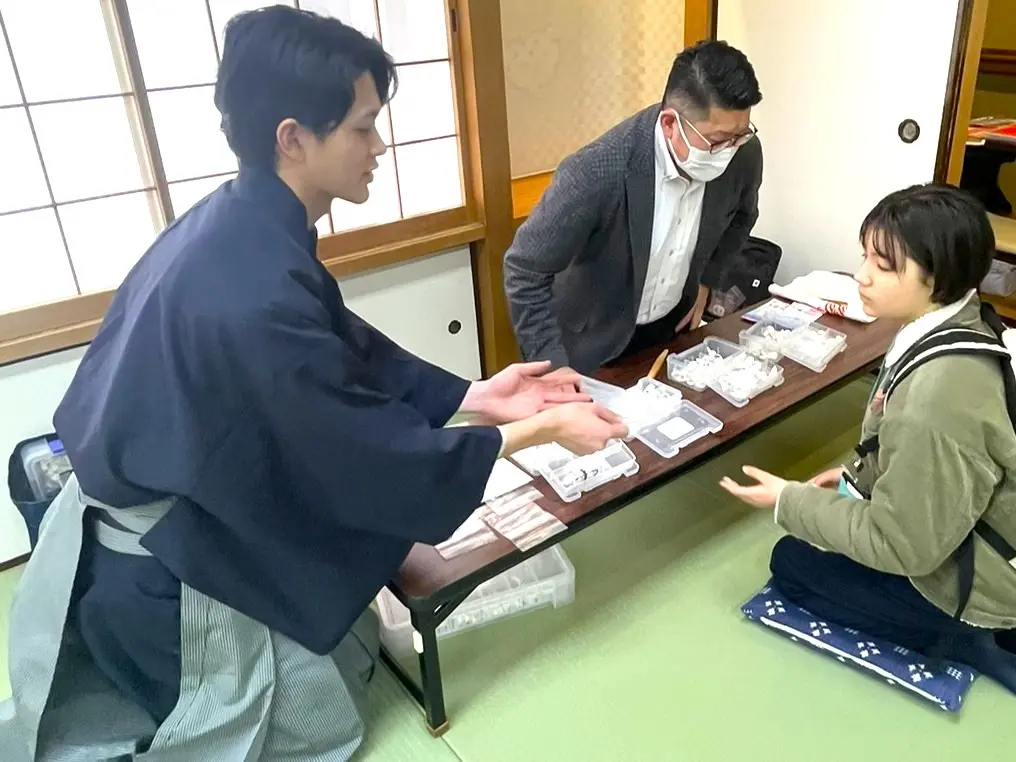 自分の指に合ったサイズの“箏爪(ことづめ)” を受け取って、お稽古場に入ります。