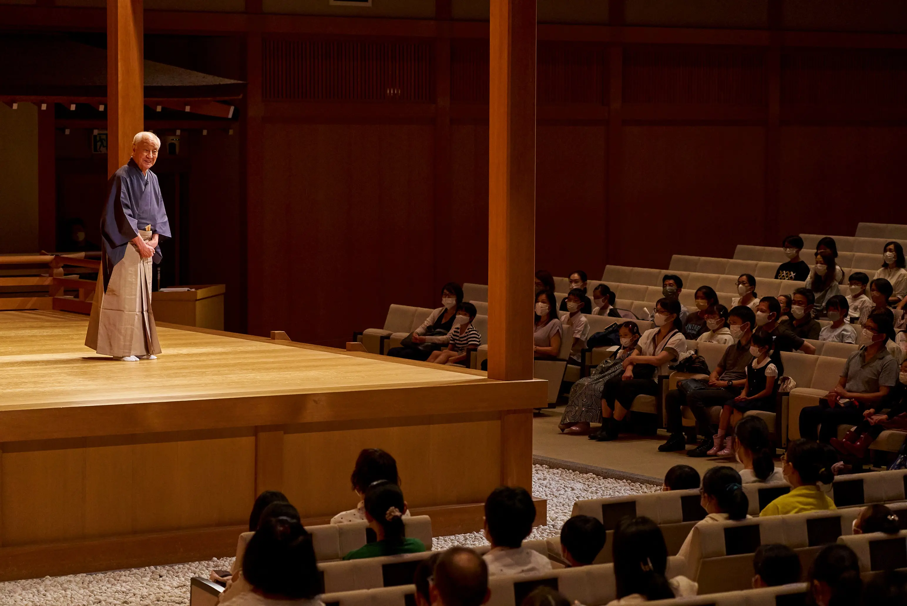 この事業の総責任者というべき存在で、狂言の人間国宝でもある立場を踏まえて、子供たち一人ひとりにお稽古の心得を伝えました。