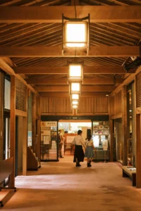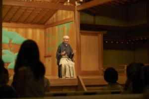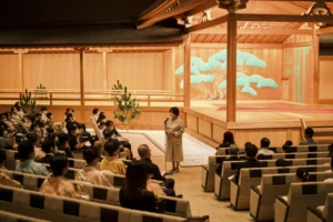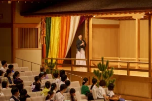 午後の部では能舞台の小道具 “葛桶(かずらおけ)” を使って、「これに腰かけるときには、背もたれがありません。そうすると、背筋をしっかり伸ばして後ろに寄りかからずに腰かけることが大切です」。