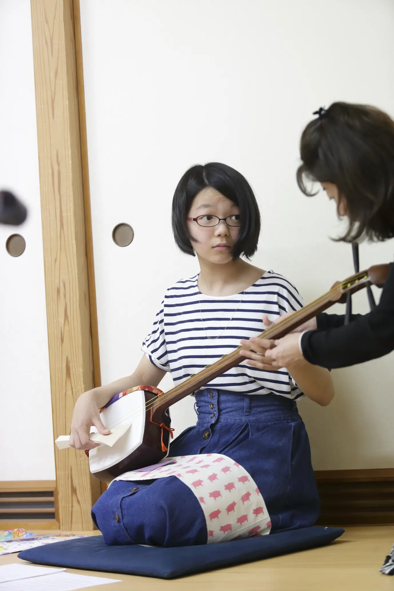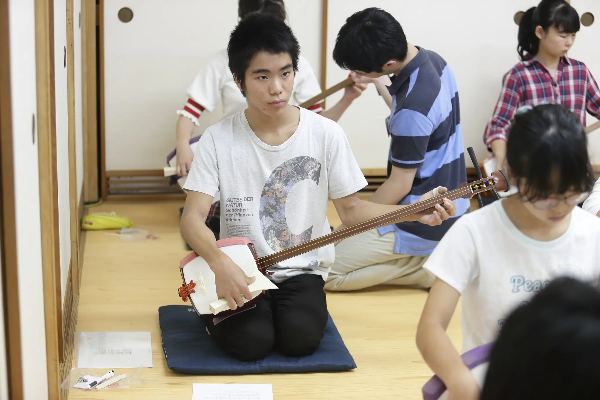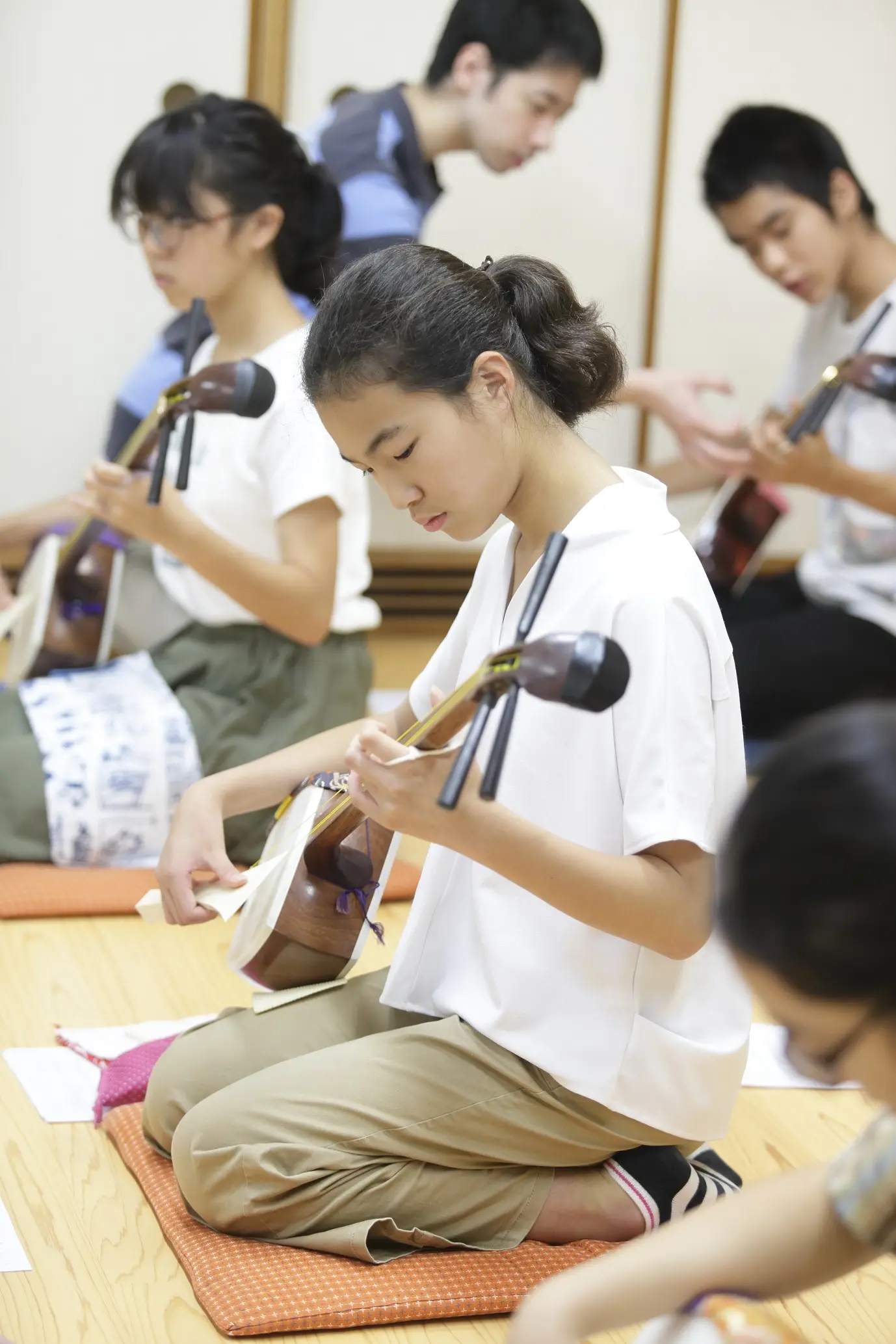 三味線コースは、耳を澄まして自分たちで楽器の調弦まで行います。