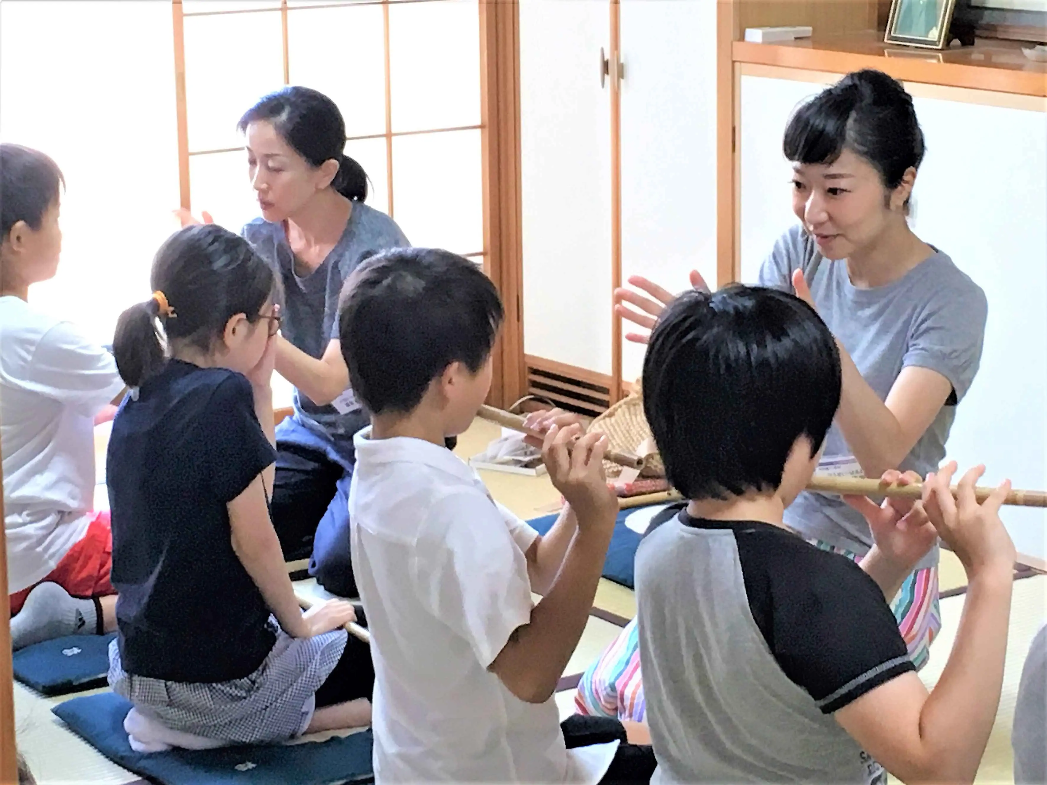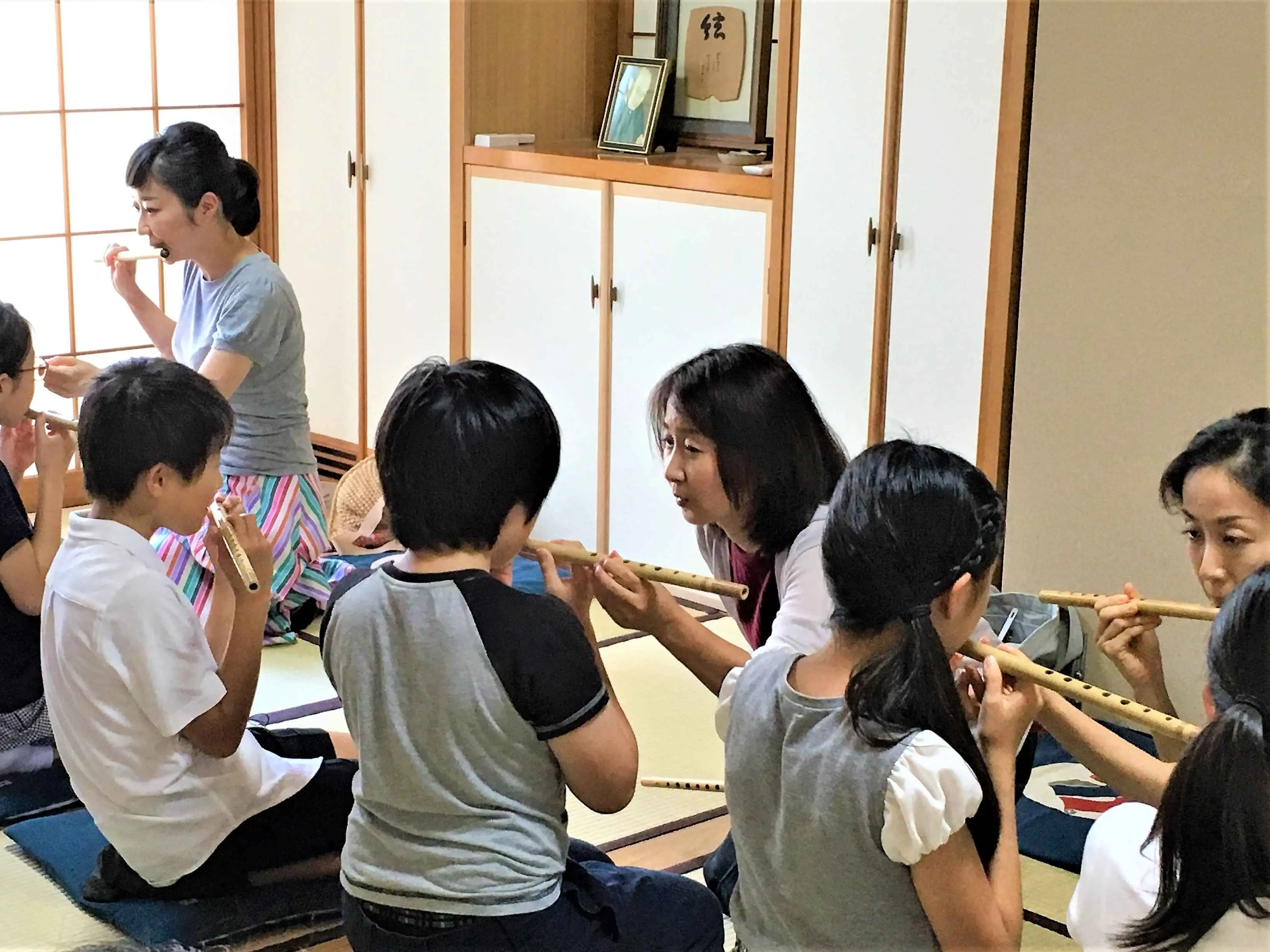 先生にひとつずつ指づかいを教わり、うた口に息を吹きかけます。